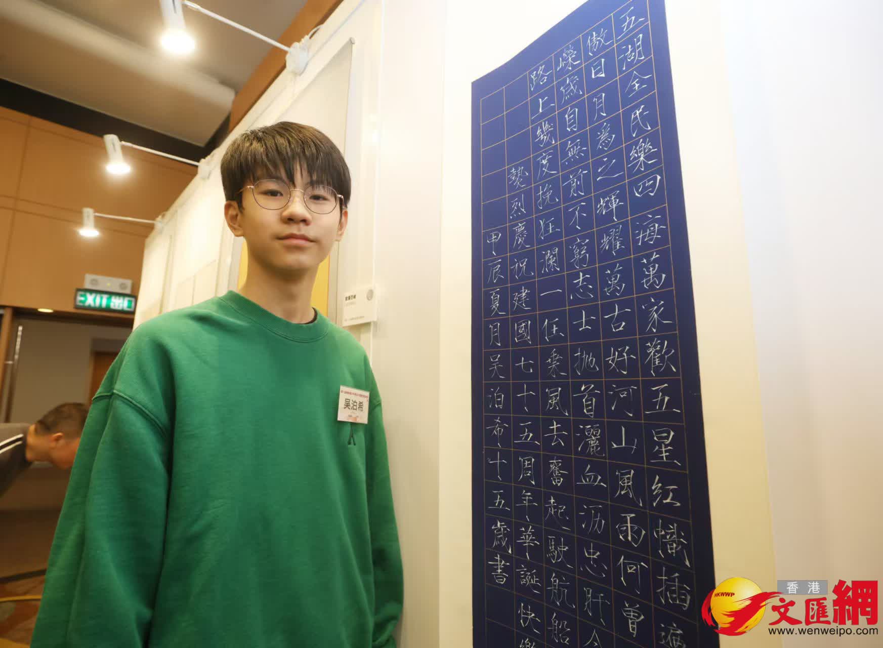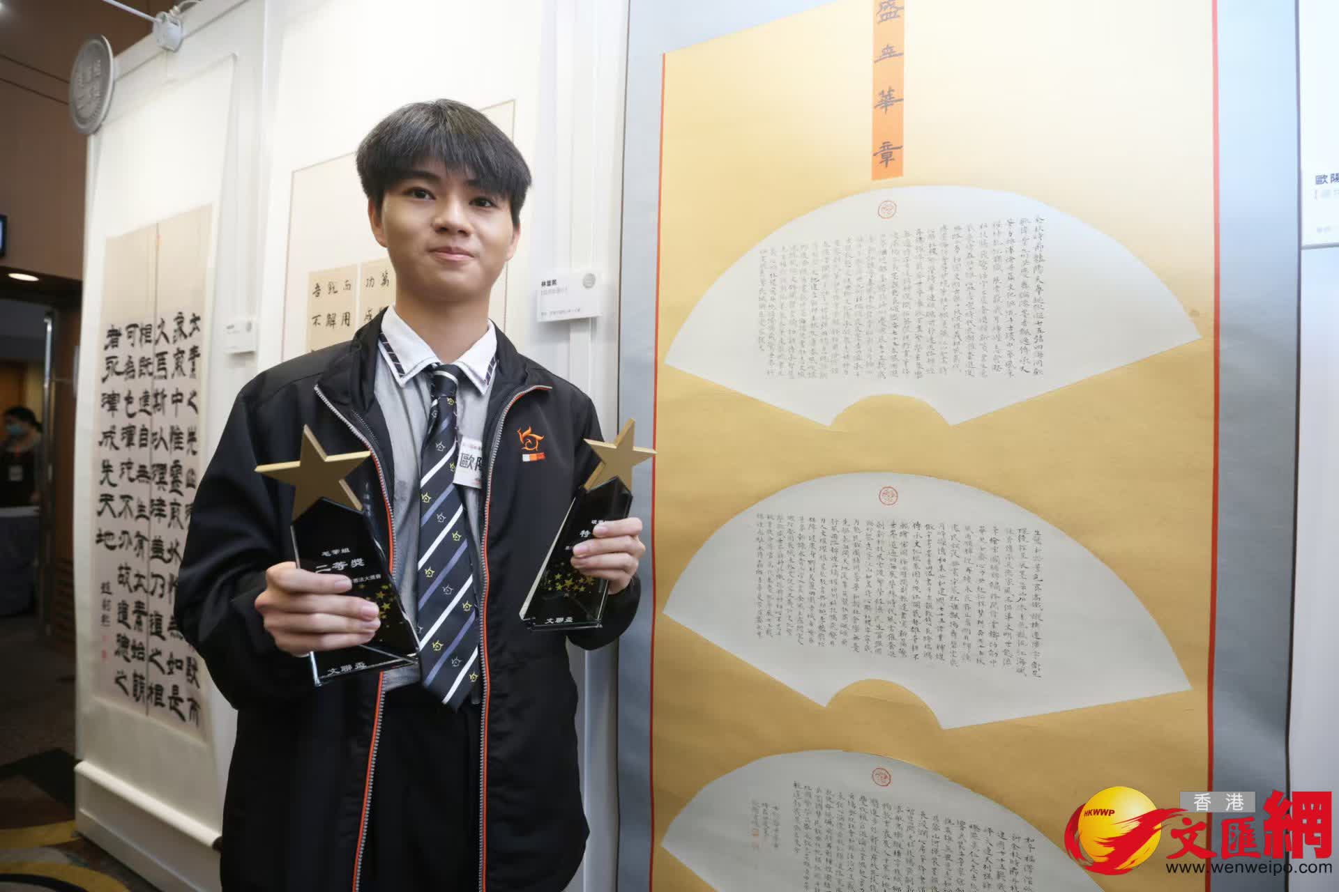 在本屆香港青少年書法大獎賽中,硬筆書法特等獎得主是來自培僑書院龍華信義學校的中四學生歐陽百峻。他今日向香港文匯報記者分享指,自己早於小學階段已有參加首屆書法大賽,形容在大獎賽中留下了童年到青春的許多回憶。他認為這個比賽為自己和一眾熱愛書法的同學提供一個極好的平台,自己更在這裏結識眾多志同道合的好友,彼此交流學習,互相進步。