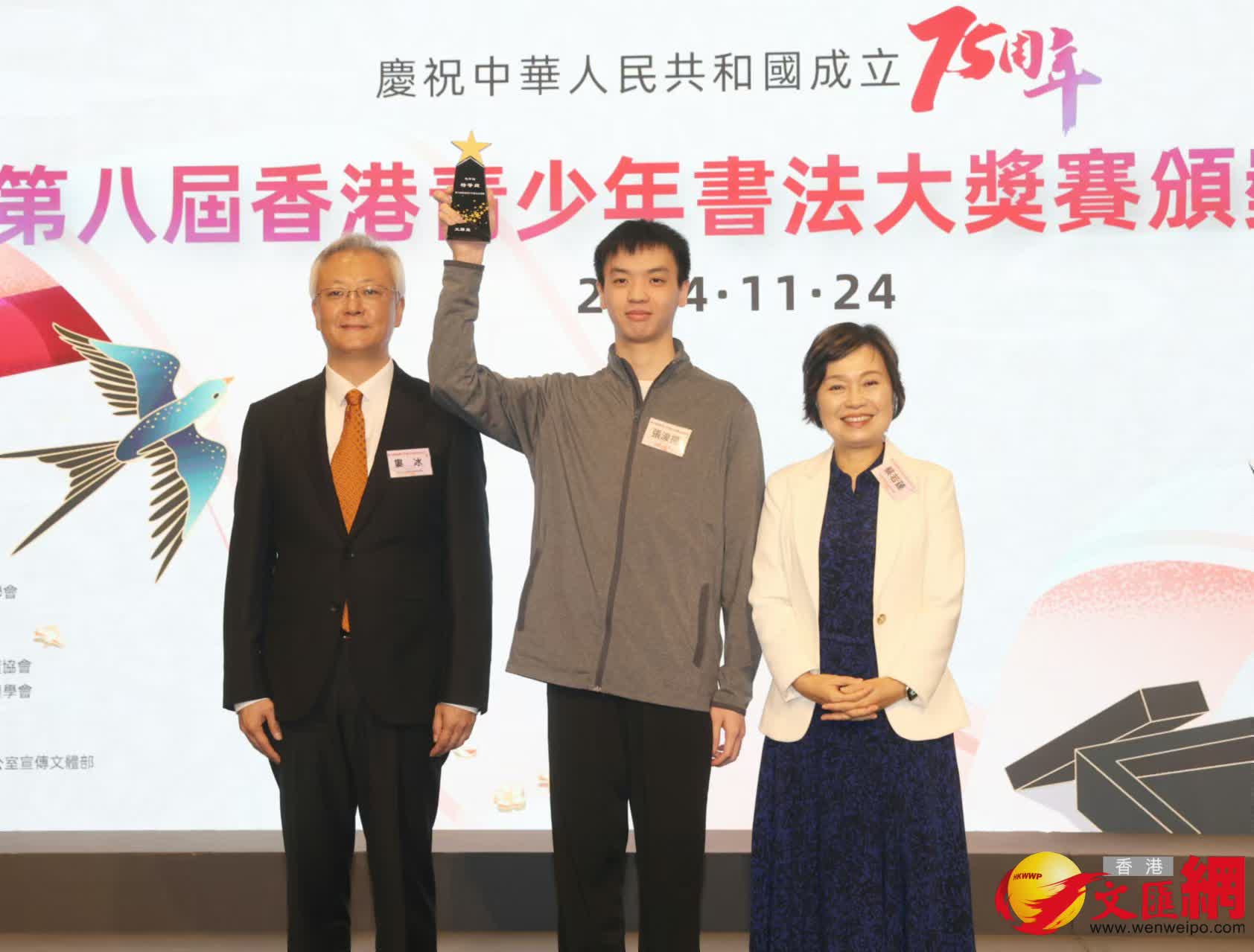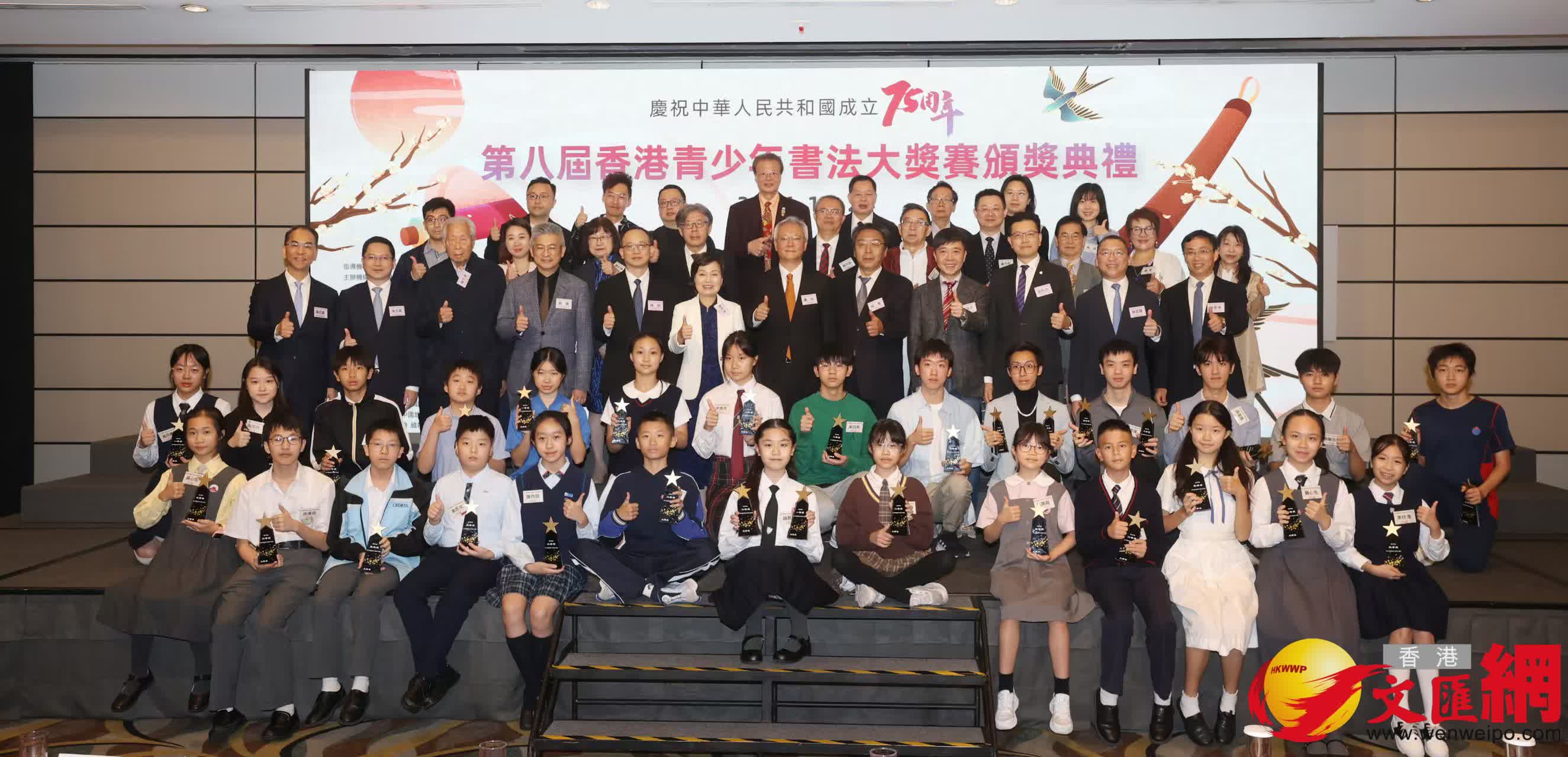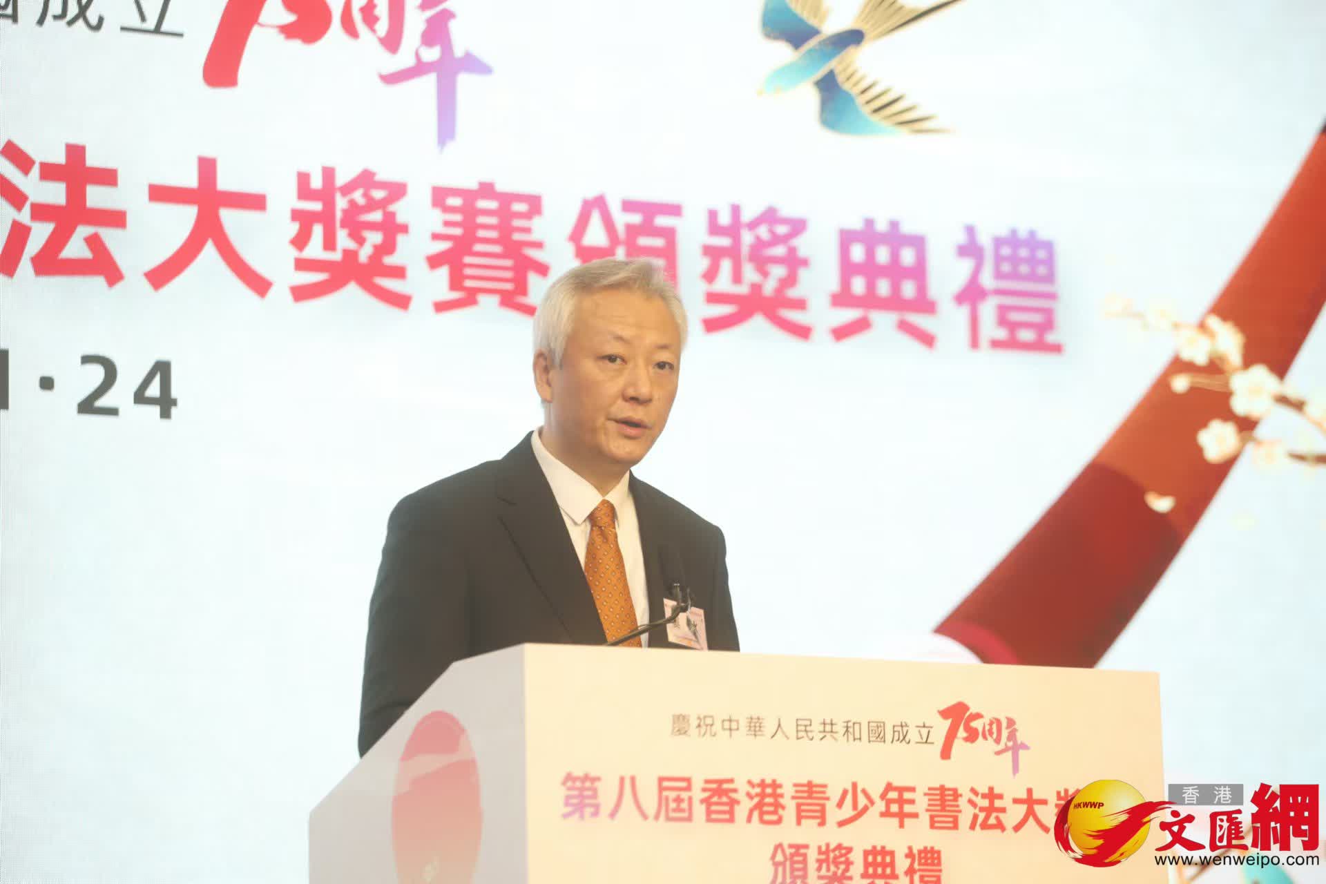 香港文匯報訊(記者 莫楠)「文以載道,以文化人」,做好中國人,書好中國字,這不僅是文化的連結,更是中華民族血脈的延續。為鼓勵香港青少年以書法形式抒發對祖國新時代的熱愛,香港大公文匯傳媒集團、中國書法家協會、中國文學藝術界聯合會香港會員總會攜手舉辦「第八屆香港青少年書法大獎賽」,今日(24日)在香港會展舉行頒獎典禮。本屆大賽以「慶祝中華人民共和國成立75周年」和「墨韻傳承文化力、筆鋒書道新時代」為主題,吸引了全港近270所中小學提交近4,000幅參賽作品,最終評選出毛筆、硬筆作品共138幅。教育局局長蔡若蓮主禮並致辭指,希望同學們繼續深入認識書法藝術,弘揚書法之道,感受文化之美,為傳統文化賦予新時代氣息,讓中華文化瑰寶發揚光大。