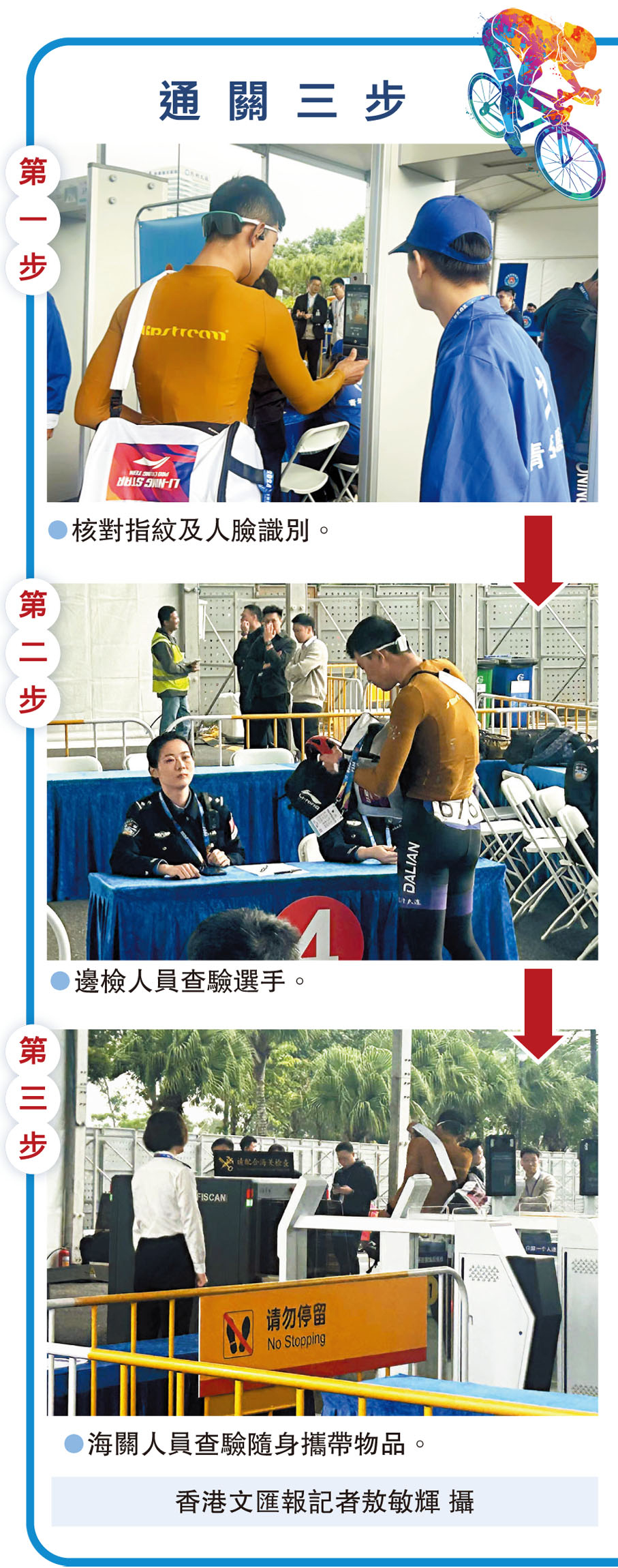 賽事起點設置了臨時通關查驗區,邊檢、海關工作人員入駐工作。昨早7時許,一眾選手陸續開始辦理通關手續。香港文匯報記者於現場所見,通關過程分為三個步驟,選手首先在智能設備上按指紋,同步配合人臉識別,過程不超過5秒。後續兩個步驟,分別是邊檢和海關對選手和隨身攜帶物品進行查驗。有選手反映,整個過程不超過1分鐘。