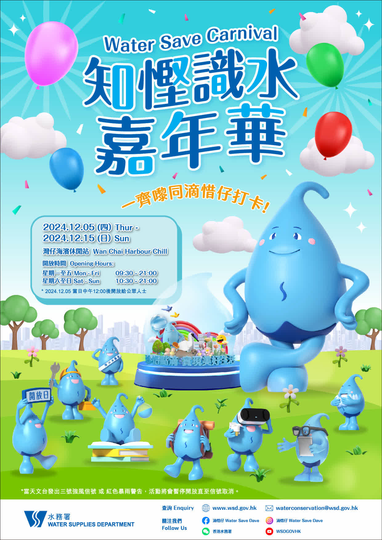 水務署於12月5日至15日在灣仔HarbourChill海濱休閒站舉辦「知慳識水」嘉年華。嘉年華以「不缺水的未來‧由你開始」為主題,旨在透過一系列有趣好玩的活動提醒市民節約用水,共同創造不缺水的未來。