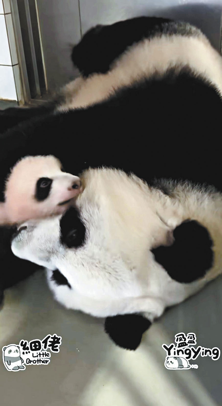 香港文匯報訊 大熊貓「盈盈」今年8月誕下一對龍鳳胎,BB們如今已近4個月大。海洋公園昨日於社交專頁上傳視頻,分享「盈盈」和細佬的親子時光,只見身為媽媽的「盈盈」母愛爆棚,對龍鳳胎BB格外寵溺。