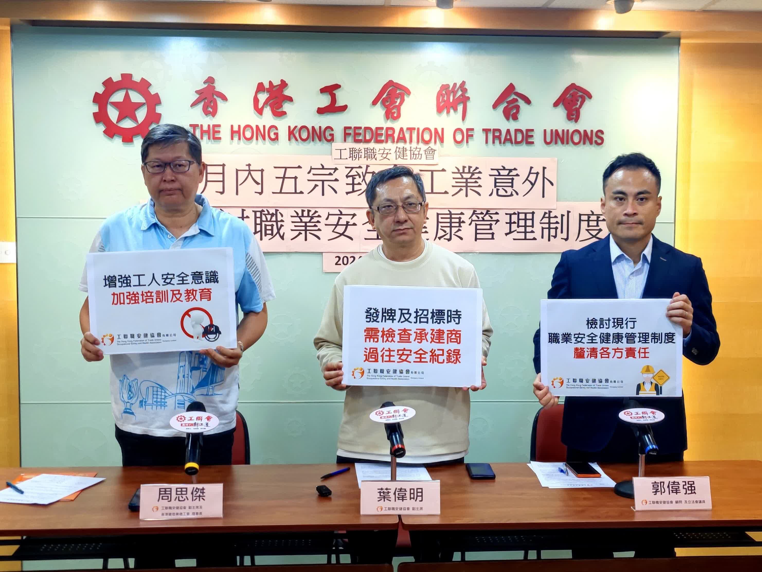 香港文匯報訊(記者 王僖)上月不足一個月時間,已有5名工人因工業意外死亡。工聯職安健協會(下稱協會)今日與香港建造業總工會一同召開記者會,促請政府盡快徹查意外成因,檢討現有職業安全健康管理制度,建議修例釐清各方責任,以及將安全紀錄列為發牌和招標標準,安全表現會影響其續牌及招標的機會。