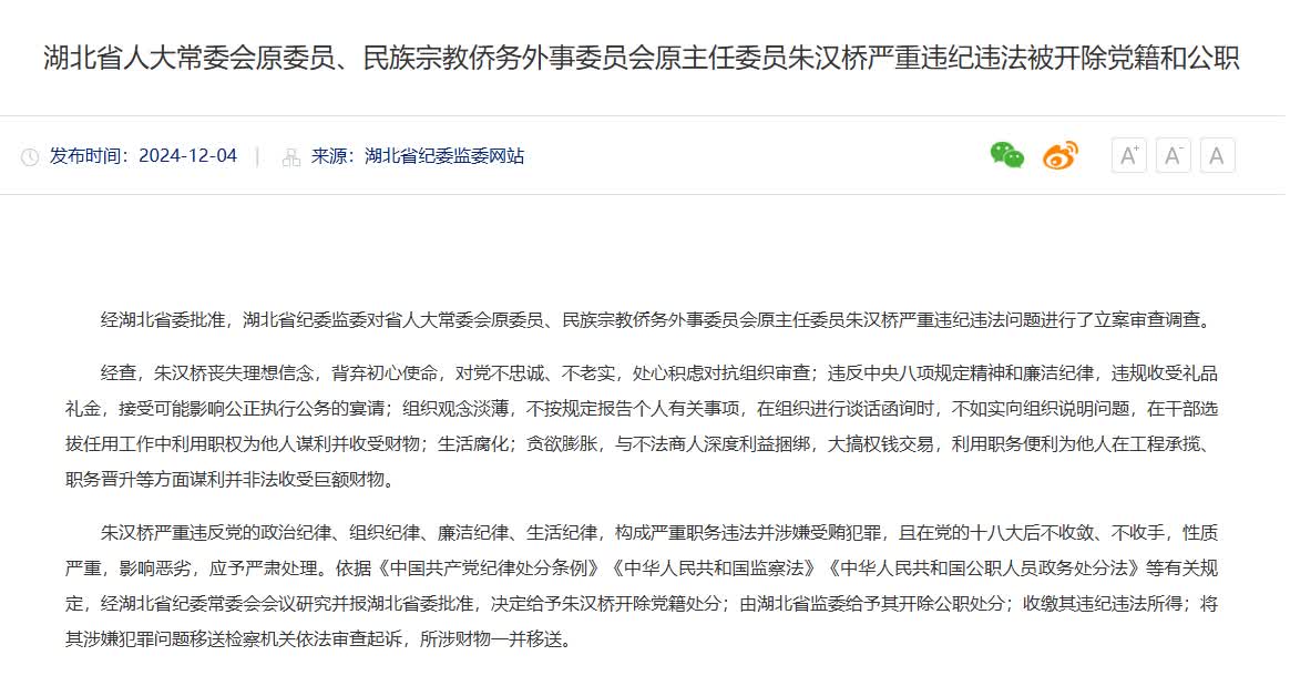 據湖北省紀委監委網站消息,經湖北省委批准,湖北省紀委監委對省人大常委會原委員、民族宗教僑務外事委員會原主任委員朱漢橋嚴重違紀違法問題進行了立案審查調查。