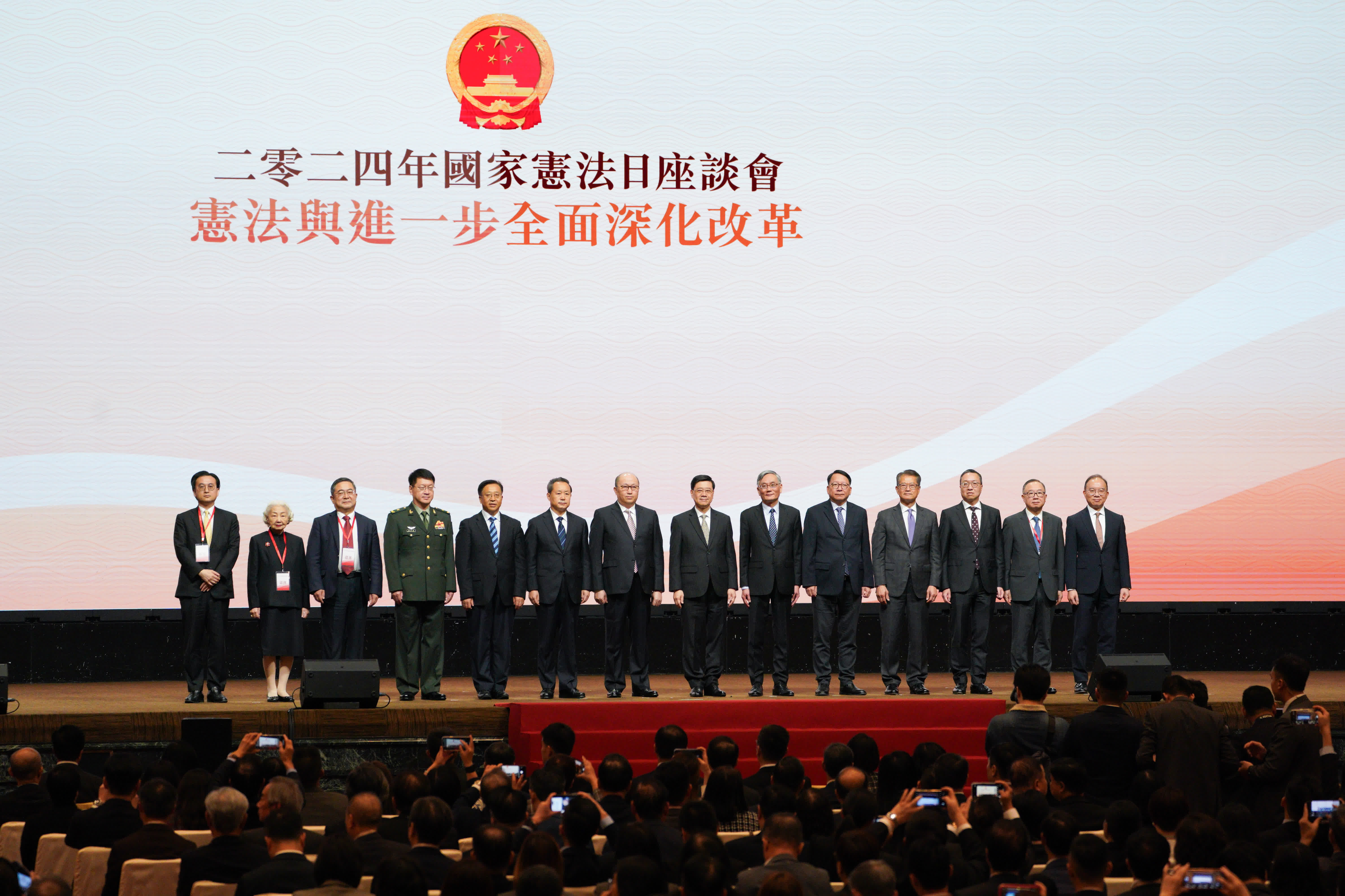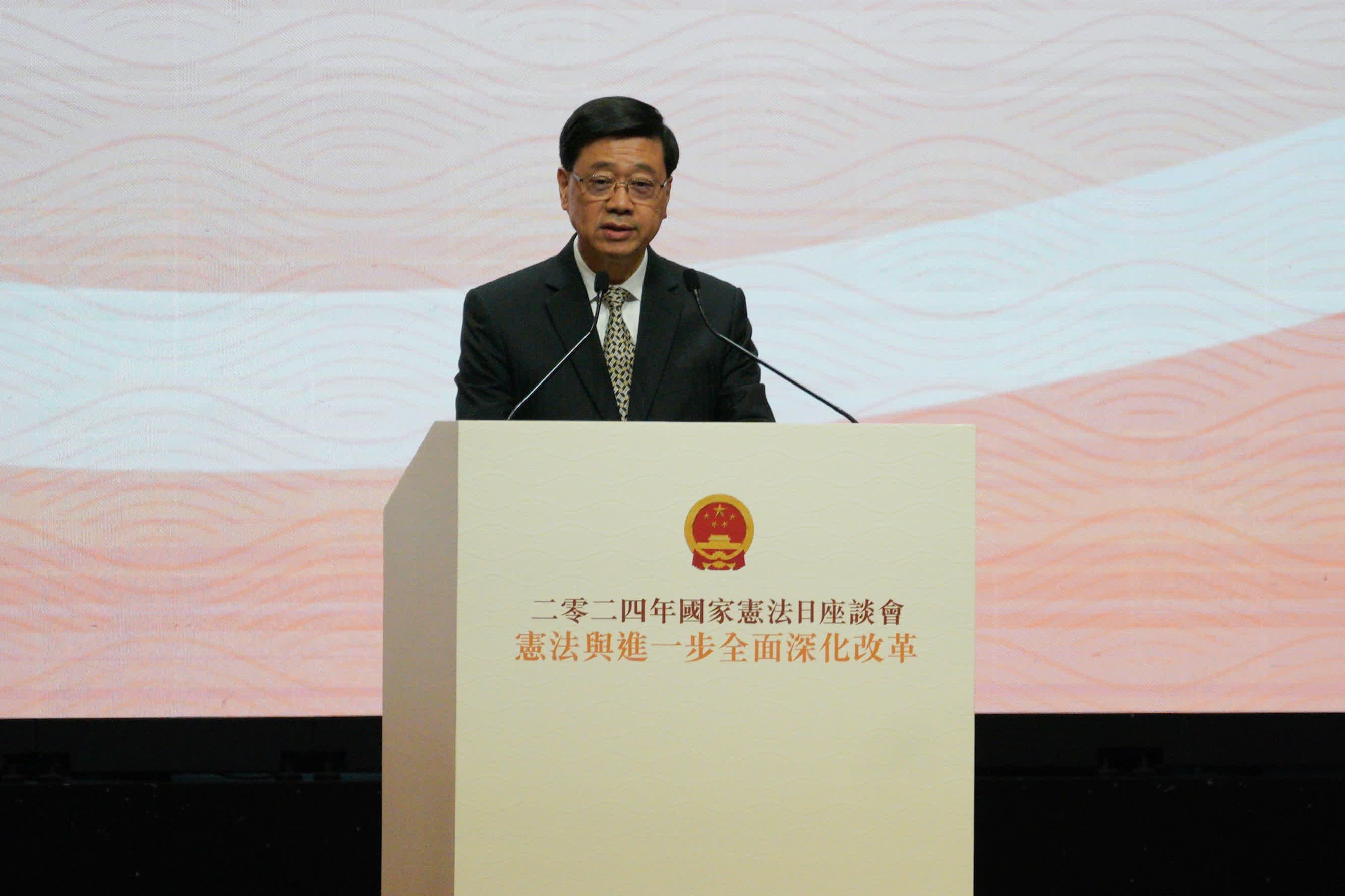 李家超表示,一年一度的國家憲法日正是弘揚憲法,加深公眾認識憲法的重要教育日子。在國家憲法之下應該如何發揮好香港角色?二十屆三中全會審議通過的決定共提出了300多項重要改革舉措,引領國家邁向中國式現代化及高質量發展,涵蓋全面而廣泛的範圍,包括:政治、經濟、文化、社會、生態文明、國家安全等方面的改革部署,各項改革的內容都同香港息息相關,而貫穿其中的重要主軸要求就是,特區要發揮好「一國兩制」的制度優勢。
