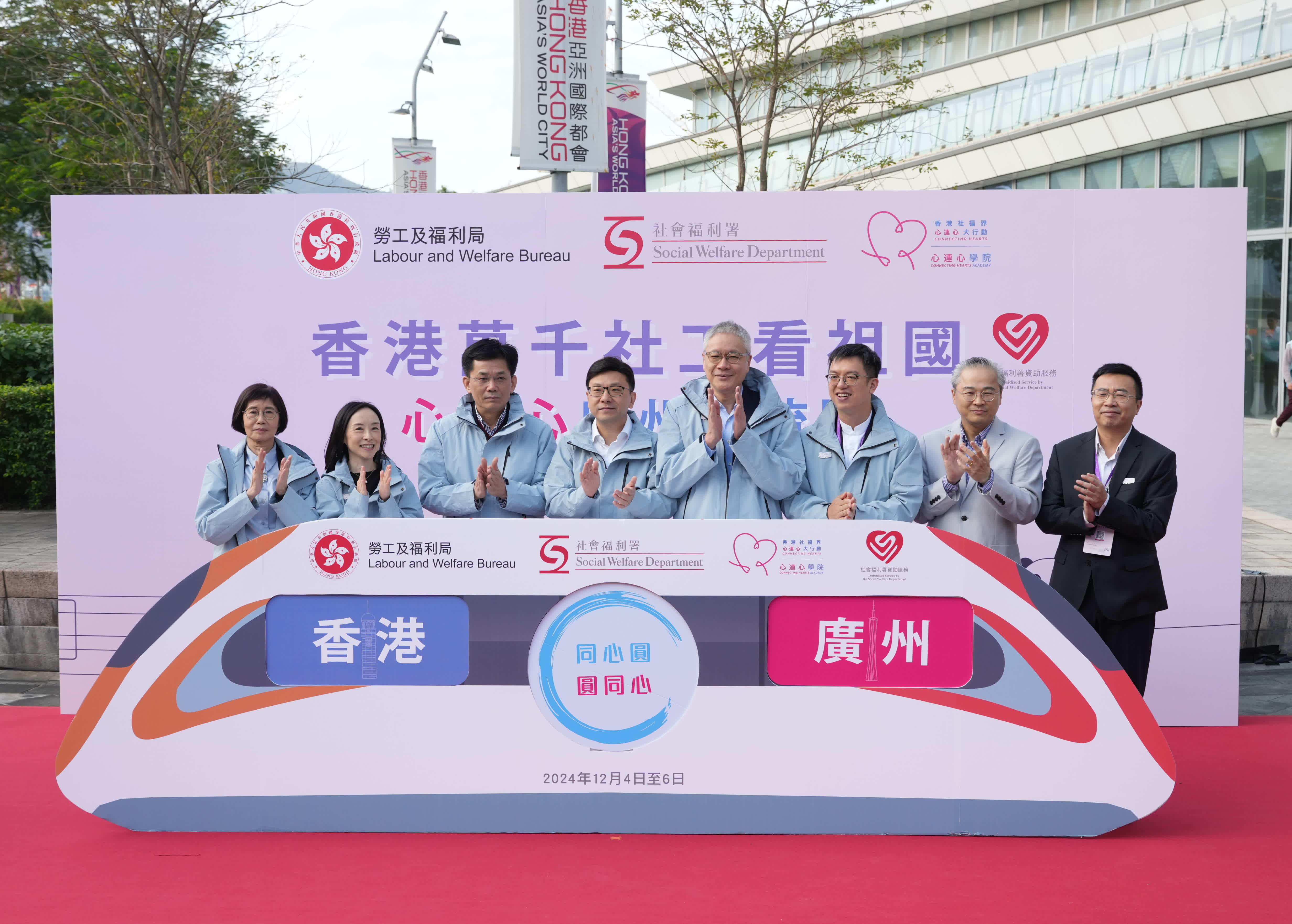 早上8時,特區政府勞工及福利局局長孫玉菡來到西九龍高鐵站為交流團送行,他在啟動禮上致辭表示,在特區政府專項基金的支持下,「心連心」受政府委託今年以來已舉辦兩次社福界交流團,分別前往潮州市、韶關市,加上今次廣州交流團,總參與人數超過1,000位,他感謝兩地各有關單位的支持和協助。