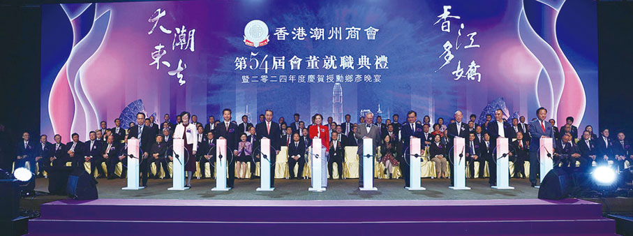 出席就職典禮的嘉賓還有:全國人大常委李慧琼、全國僑聯副主席劉藝良、中央政府駐港聯絡辦社團聯絡部部長蘇玉軍、協調部副部長陳澤濤、港島工作部副部長楊成偉、九龍工作部副部長祝小東、新界工作部副部長李功勳、香港特區政府商務及經濟發展局副局長陳百里、遼寧省海外聯誼會副會長張彥琳、廣東省僑聯副主席莊創業、廣東省工商聯秘書長關向明、汕頭市政協主席邱奕輝、汕頭市委統戰部部長蔡永明、香港中華總商會會長蔡冠深、香港廣東社團總會主席龔俊龍、香港潮屬社團總會主席陳振彬、全國政協常委高永文、全國政協常委王惠貞、全國人大代表及政協委員、特區行政會議成員、立法會議員、本港多間大學或學術機構高層、教授及學者、傳媒高層、各界知名人士、社團首長,廣東省及潮汕三市領導、以及黑龍江大學代表等;包括美國、加拿大、挪威、英國、法國、非洲、新加坡、菲律賓、柬埔寨、老撾、澳門、北京、天津、上海、四川、廣西、海南、青島、杭州、蘇州、紹興、廣州、深圳、珠海、佛山、東莞、梅州、湛江、韶關等來自150多個海內外各地潮團的代表及本港社團首長共1,500多人出席道賀。