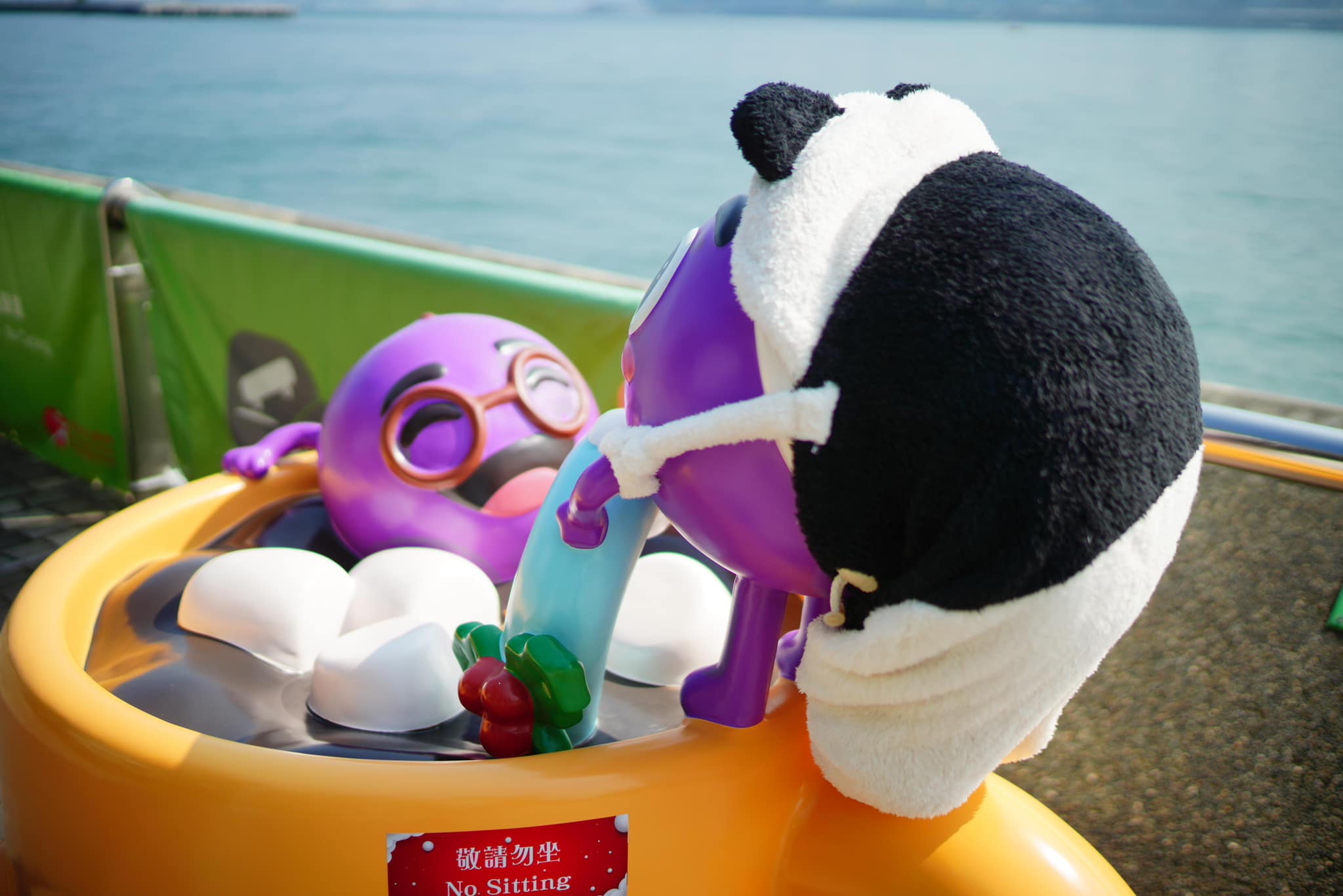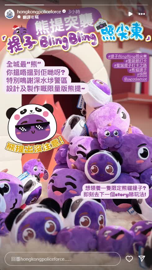 香港文匯報訊(記者 蕭景源)由深水埗警區製作的特別版「熊提」掛飾,已經「迫爆」尖東海濱路其中一間小屋。其造型得意可愛,還有數隻聖誕提子匿藏在熊貓皮內。