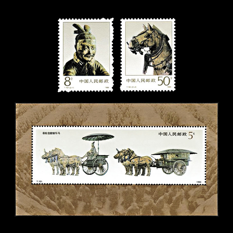 1990年6月20日,為展現中華民族的偉大創造精神和優秀文化傳統,中華人民共和國郵電部發行一套《秦始皇陵銅車馬》特種郵票,全套2枚。這套郵票的2枚圖案,分別選取了「安車」上的御官和驂馬(即駕在車兩側的馬)的頭部近景,猶如特寫鏡頭。將秦代藝術家驚人的造型藝術和創作才能表現得更加清晰,更加生動;而且,2枚郵票圖案所表現的銅車馬及御官的局部,與小型張所表現的銅車馬整體形成呼應,相得益彰,恰到好處。