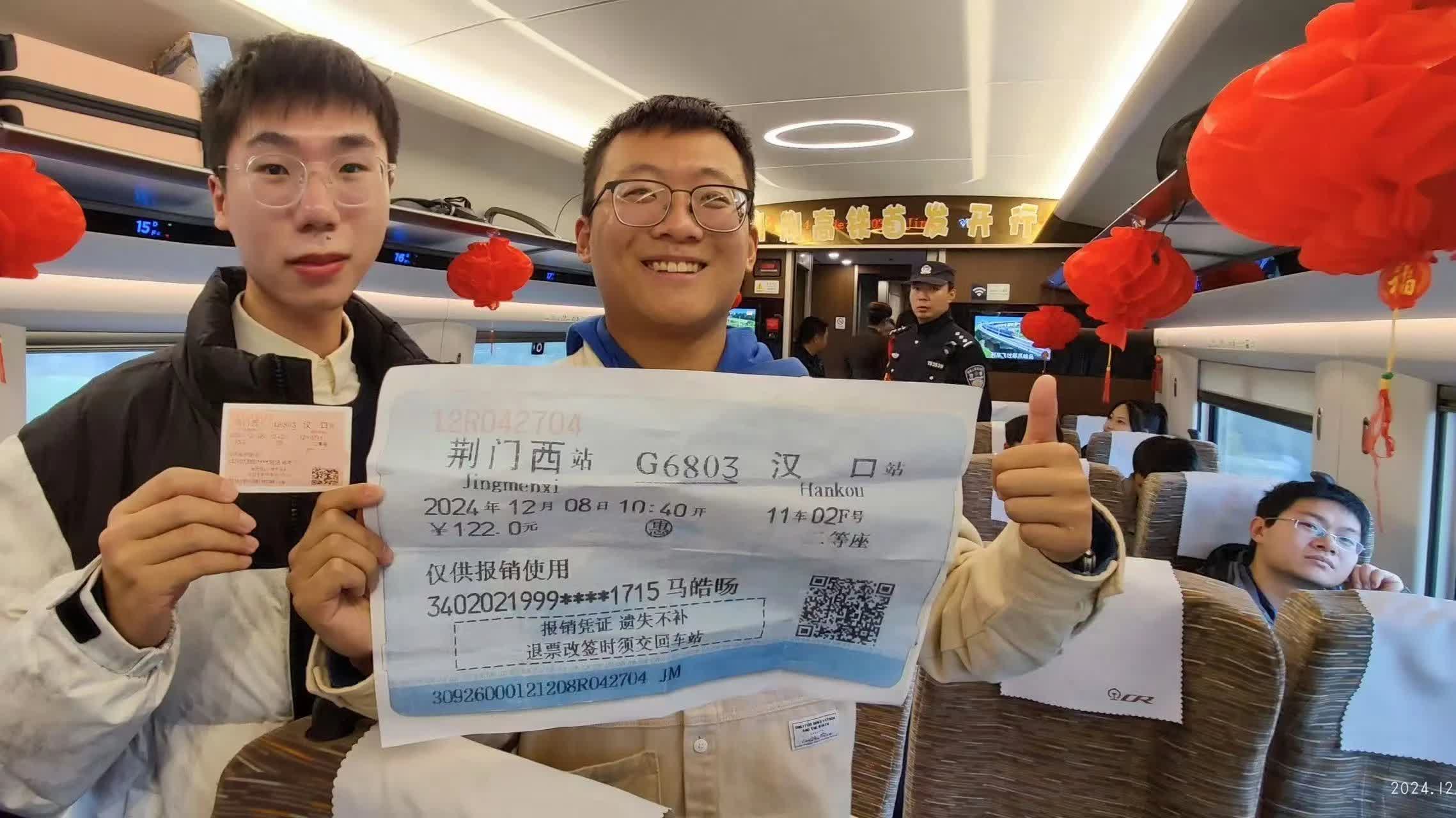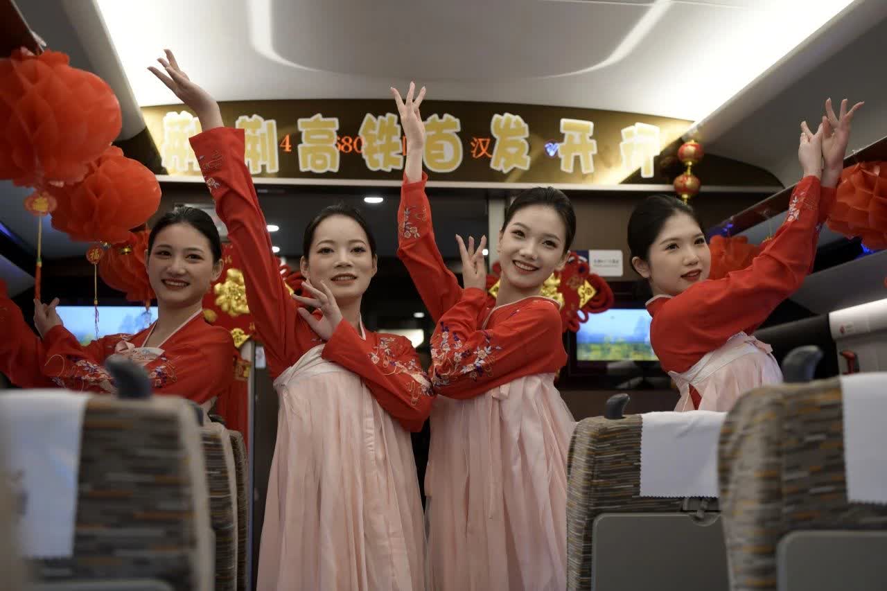 列車沿着江漢平原一路疾馳,車廂外良田村落一閃而過,車廂內文藝節目精彩紛呈。4號車廂內,「荊荊高鐵首發開行」幾個大字格外醒目,兩側的行李架上裝飾着喜慶的紅色燈籠。武漢客運段的列車員精心策划了一系列文藝表演,禮儀操展示《中國復興號》、舞蹈《楚韻鳳舞》、器樂串燒《我的祖國》等節目輪番上演。曼妙的舞姿、動人的旋律,旅客們的熱烈掌聲……車廂內熱鬧非凡,充分展現了荊門人民對這條高鐵的期盼之情。
