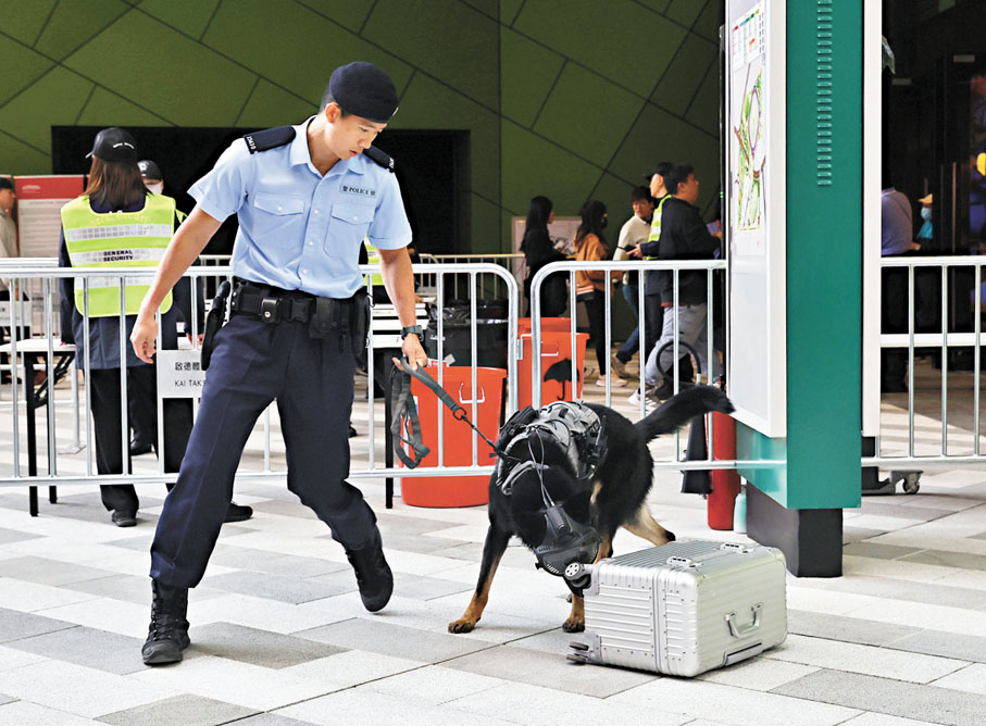 在體藝館外,警方示範如何處理無人認領物件,現場模擬有人在場地主入口留下一個行李箱,場地保安與活動控制室和警方溝通協調後,警方封鎖現場並派出巡邏爆炸品搜索犬。經檢查無危險後,開箱確認,之後交回保安作失物處理。