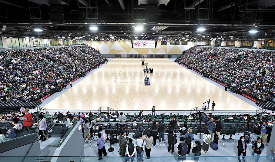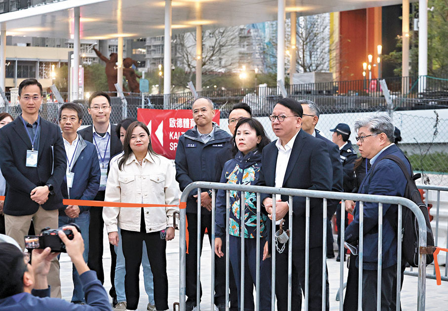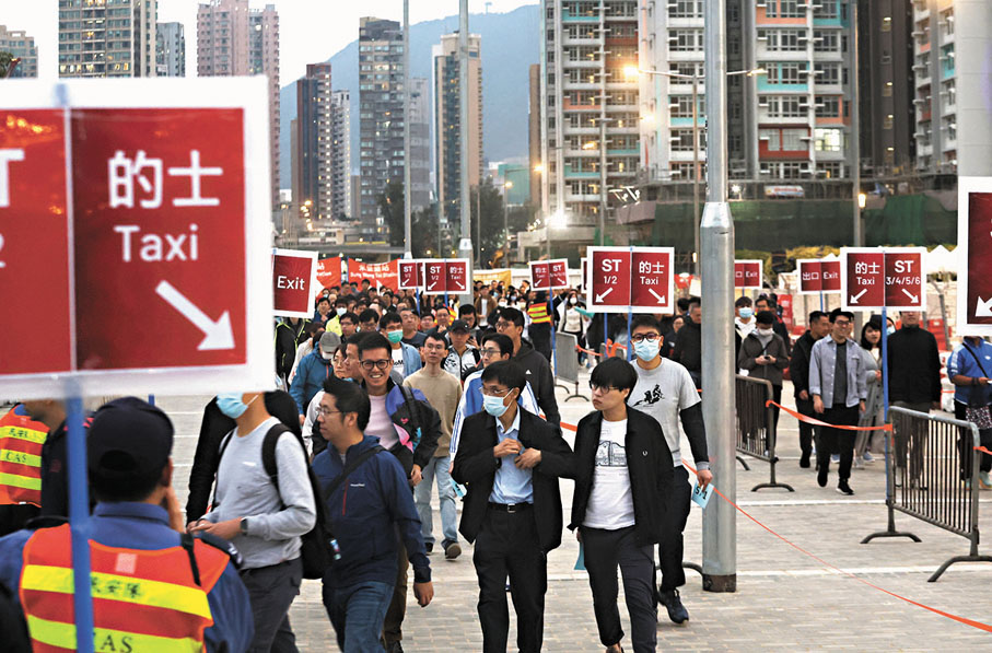 隨着啟德體育園全面啟用日子愈來愈接近,香港特區政府昨日聯同園區進行第二次演練,參與人數由上次的5,000人倍增至1.2萬人,涉及園區內的啟德體藝館和青年運動場兩個場館,測試內容包括觀眾由港鐵站前往場館、進行安檢、驗票進場、到指定位置就座、火警演習,以及緊急疏散等情況,以評估兩個運動場和周邊配套設施在同時舉辦活動時的承載能力。警方總結時指測試結果良好,30分鐘內逾萬人次可經港鐵站完全疏散;另逾千人使用巴士、的士等地面交通,人流亦獲迅速疏散。香港文匯報記者昨日到場直擊,離場時大批觀眾有序登上巴士、的士,未引起地區交通混亂。而前往港鐵站的路線亦指示清晰,沿途有大量警員及民安隊成員等協助指引。●文:香港文匯報記者 唐文 圖:香港文匯報記者 郭木又