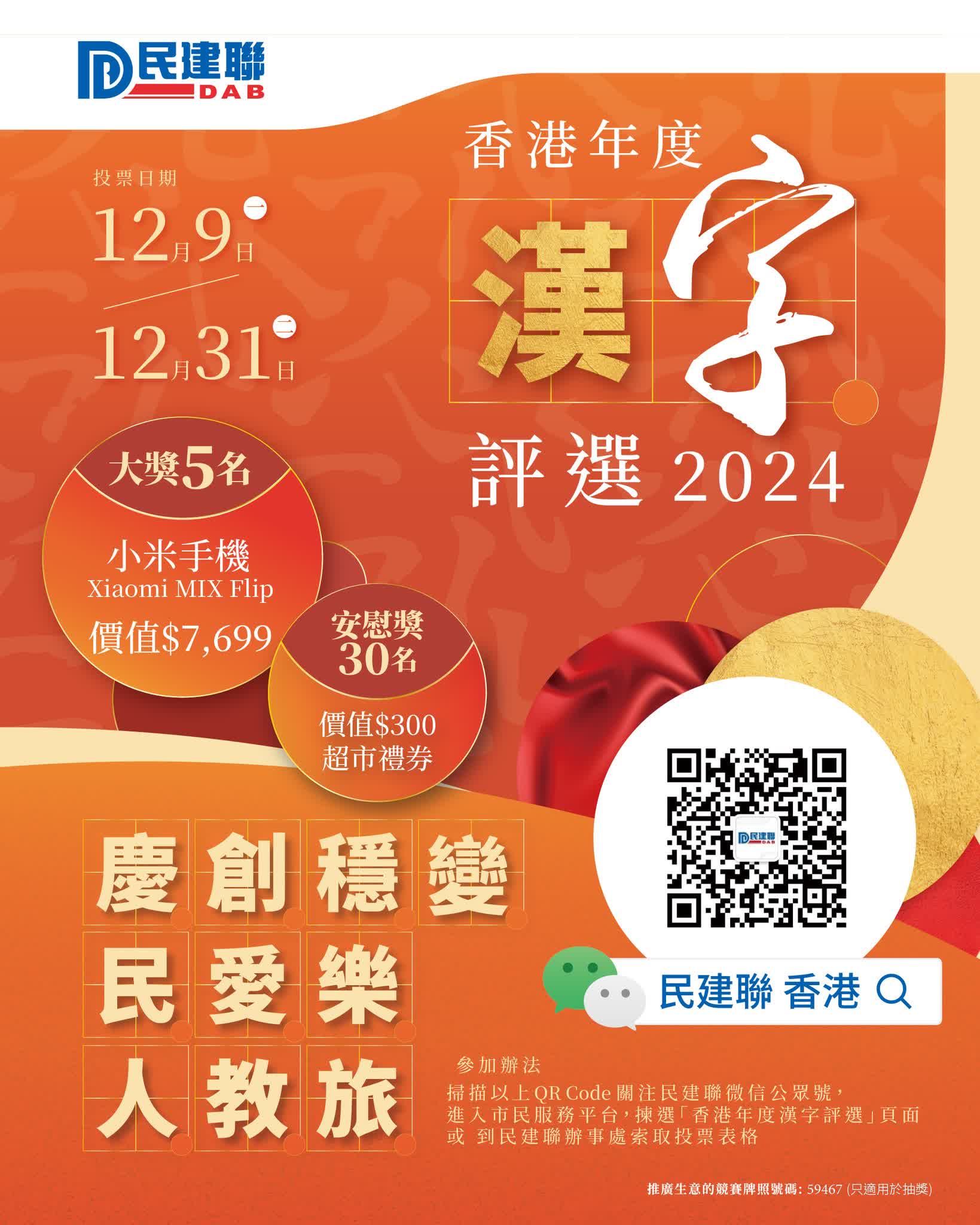 大公文匯全媒體報道:民建聯「香港年度漢字評選」今日(9日)起開始接受投票,投票者可在「人」、「愛」、「穩」、「變」、「教」、「慶」、「旅」、「樂」、「創」及「民」10個字中,選出一個代表2024年感受或社會狀況的漢字。