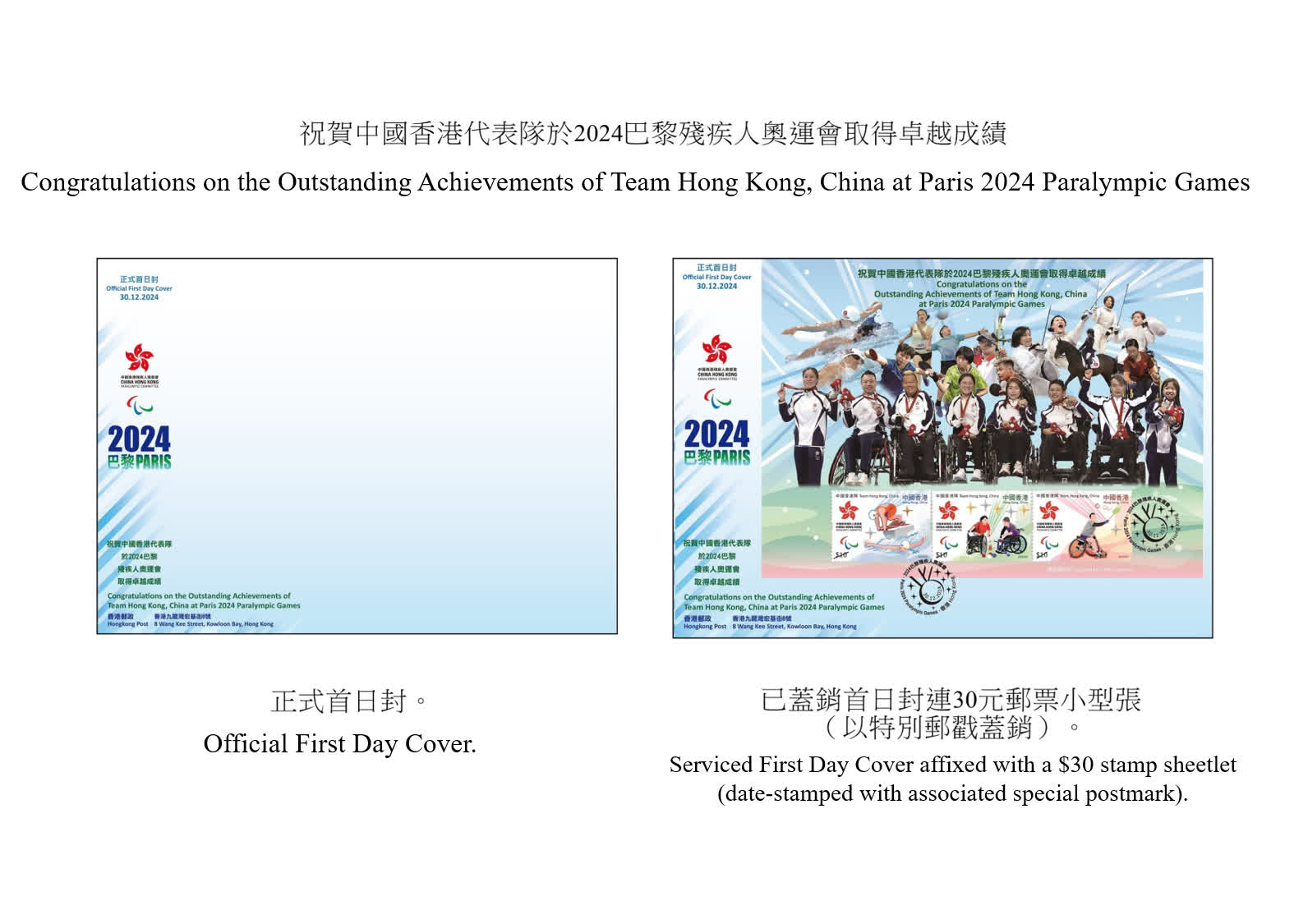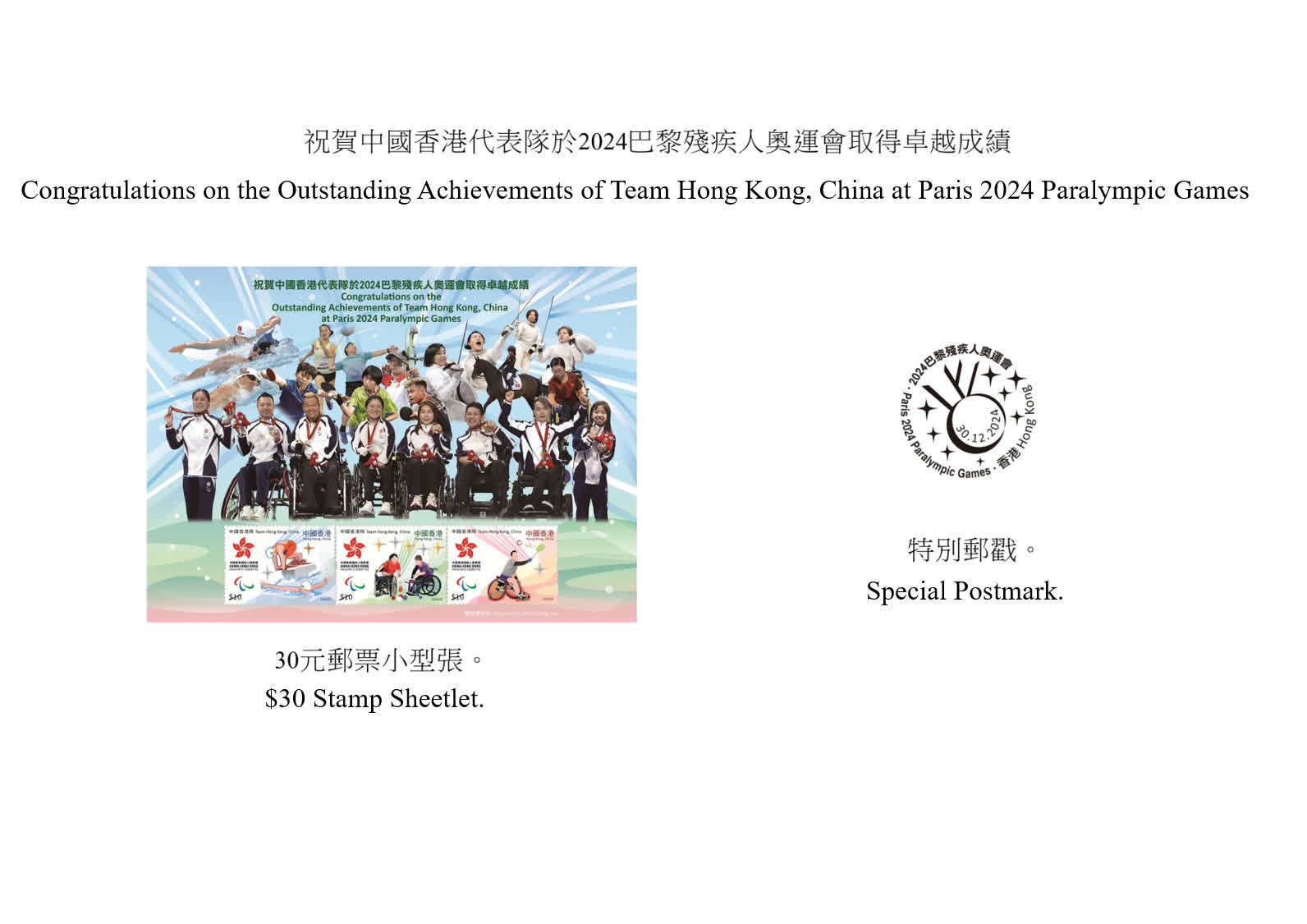 此外,中國香港代表隊亦在2024年巴黎殘疾人奧運會(殘奧會)以三面金牌、四面銀牌及一面銅牌的優異成績完成今屆賽事,創下繼2008年殘奧會後的最佳成績。為了慶祝中國香港代表隊在今屆殘奧會的超卓表現,香港郵政將發行一張以「祝賀中國香港代表隊於2024巴黎殘疾人奧運會取得卓越成績」為題的郵票小型張及相關集郵品。郵票小型張嵌有一套三枚郵票,分別展示游泳、硬地滾球和羽毛球三個得獎運動項目。每位運動員憑着無比毅力和鬥志,克服種種障礙,堅持刻苦訓練,最終能出戰殘奧會,令全港市民深感鼓舞和自豪。