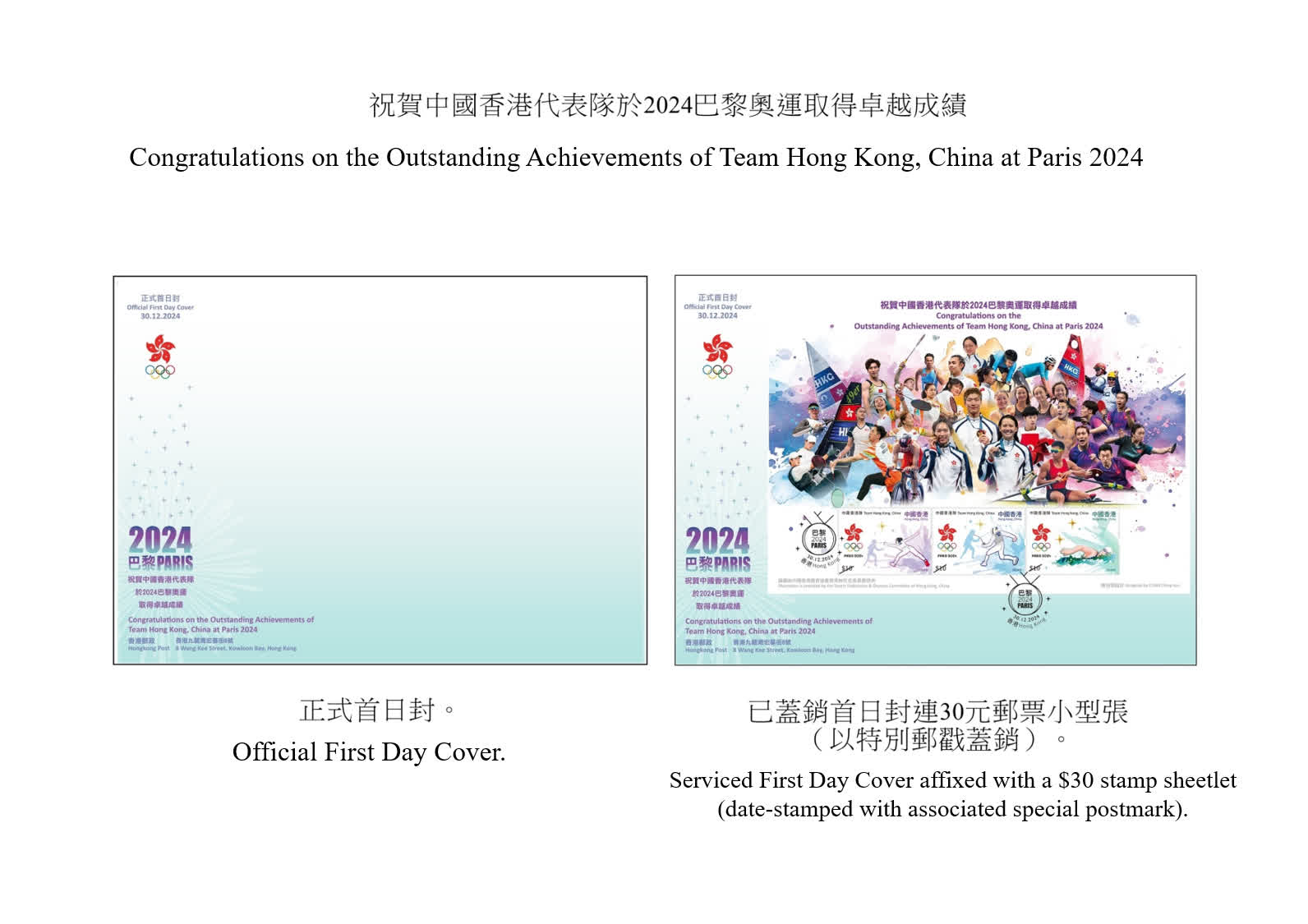 全線郵政局和香港郵政網上購物坊「郵購網」由明日(12月13日)起發售「祝賀中國香港代表隊於2024巴黎奧運取得卓越成績」及「祝賀中國香港代表隊於2024巴黎殘疾人奧運會取得卓越成績」正式首日封。郵票小型張及相關郵品將於12月30日起在各郵政局及「郵購網」發售,而貼有郵票小型張的已蓋銷首日封只限在集郵局發售。