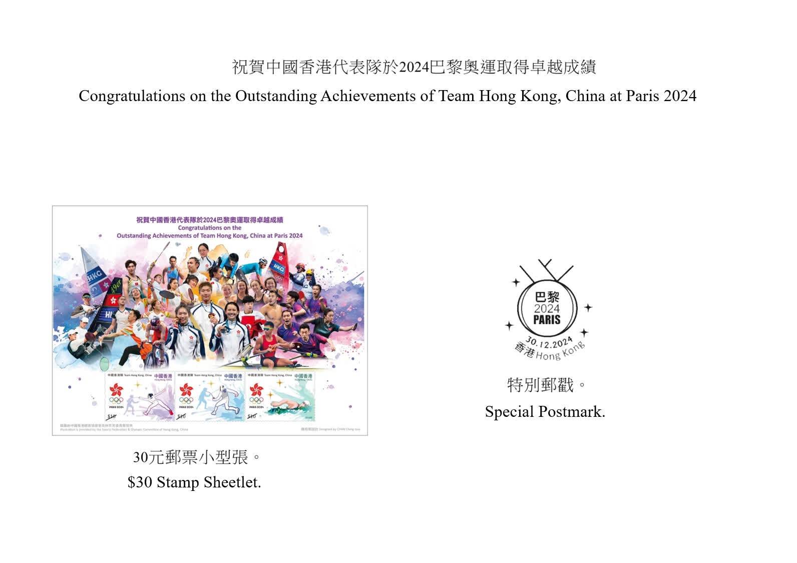 中國香港代表隊於2024年巴黎奧林匹克運動會(奧運會)中憑着堅毅的決心,勇奪兩枚金牌和兩枚銅牌,是香港首次於同屆奧運會中取得兩金的佳績,亦是首次連續兩屆取得奧運會獎牌。為紀念中國香港代表隊在奧運會創下驕人的成績,香港郵政將發行一款以「祝賀中國香港代表隊於2024巴黎奧運取得卓越成績」為題的郵票小型張及相關郵品,展示中國香港代表隊共三十五名運動員在比賽場上出色的表現。郵票小型張上嵌有一套三枚郵票,分別呈現了運動員在劍擊及游泳賽事中竭盡全力角逐獎牌的一刻,並展現對體育的熱愛及香港精神,觸動人心。