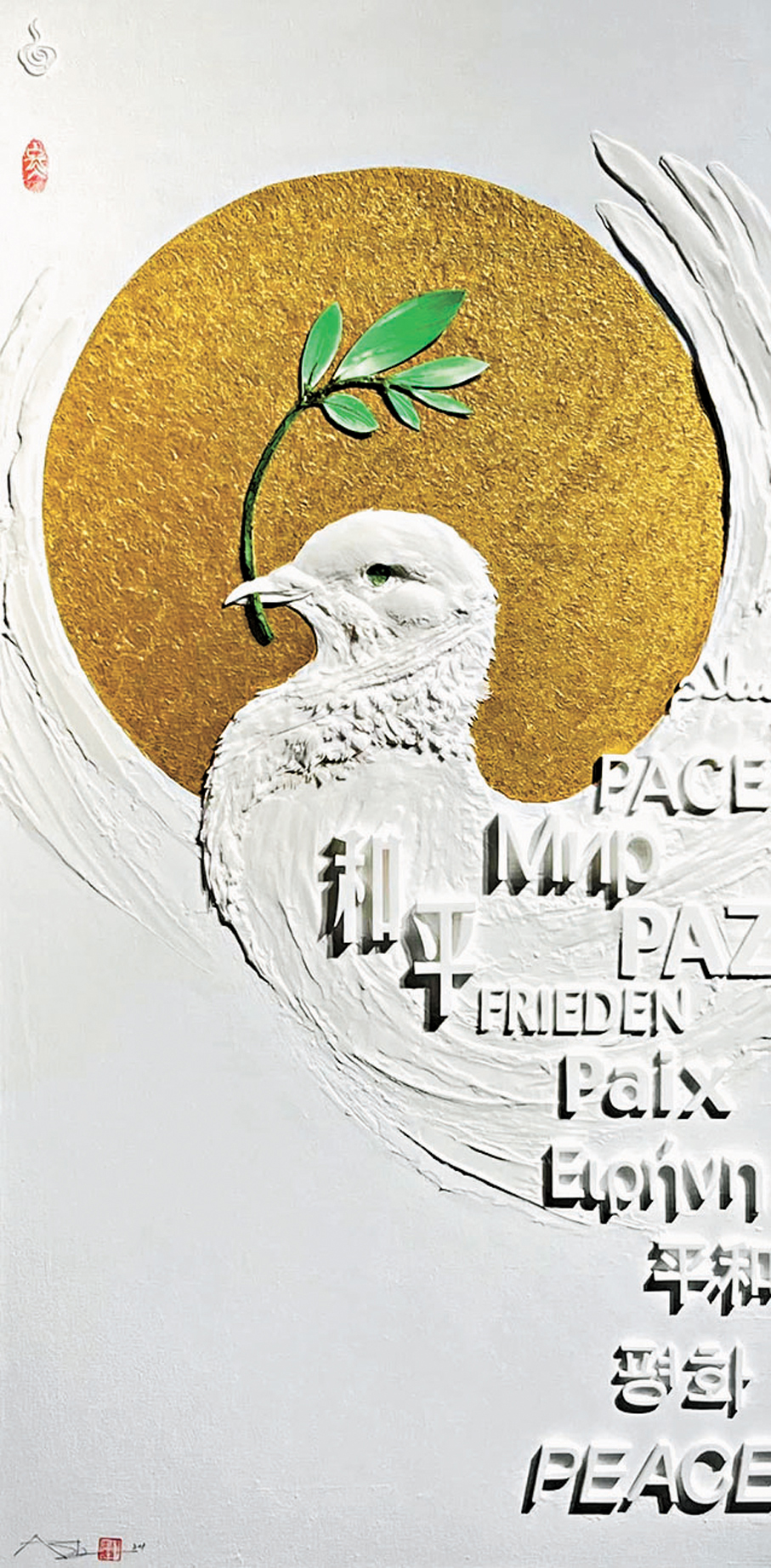 海星會長舒崇雲特意創作了一幅《和平使者》。畫面中,一隻和平鴿的展翅,包含着金色的地球。鴿身帶着不同國家「和平」的口號文字,提示各國人民以和為貴的重要性。鴿子嘴裏還含着橄欖葉,代表再一次安寧生活的開端。