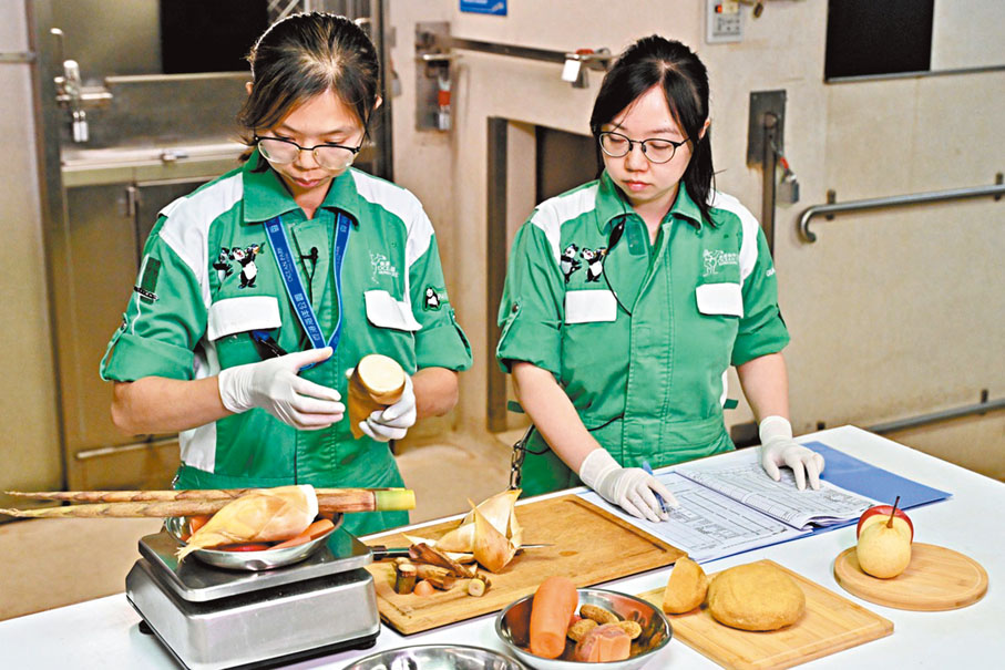 除了竹子,餐單還有竹筍、蔬果和高纖維餅乾等。大熊貓口味不一,「安安」最愛蘋果和蘿蔔,「可可」則最愛窩窩頭。窩窩頭由護理員新鮮製造,用大米粉、黃豆粉和粟米粉混合雞蛋,搓成麵團後蒸熟。