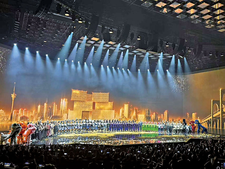 香港文匯報訊 據新華社報道,澳門回歸祖國25周年獻禮演出《澳門2049》昨日在澳門開演,以新穎方式展示中國非遺,為澳門演藝注入新活力。《澳門2049》共有8個節目,分別為神鼓·影子、呼麥·飄渺、苗歌·空靈、岔口·面具、秧歌·數控、彝聲·海洋、美獅·光芒、唱書·源起。短短80分鐘裏,集中呈現了西北花兒、蒙古族呼麥、苗族古歌、京劇、北方秧歌等8種非遺,通過現代科技賦予非遺全新的呈現形式。