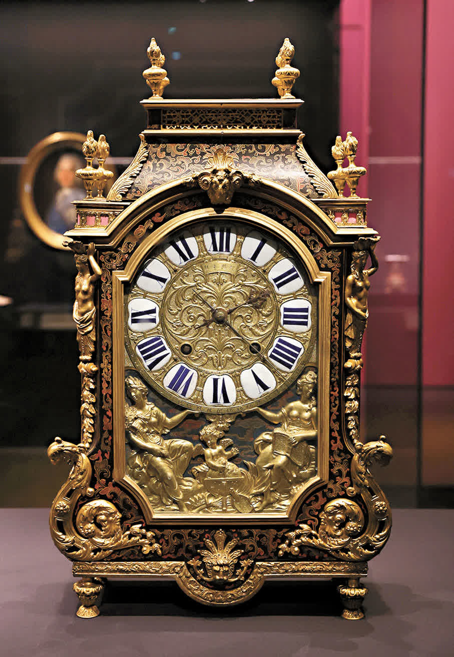 「科學與外交」單元中的一件黑漆彩繪鐘,出自路易十四宮廷御用製鐘大師——巴爾薩扎·馬蒂諾之手。該鐘通過法國傳教士送給康熙。到了乾隆時期,由於外層的布爾鑲嵌修復困難,清宮對鐘進行了局部改動,將鐘殼更換為傳統的中式黑漆彩繪板,並為鐘盤添加「乾隆年製」款。故宮博物院研究員郭福祥表示,這隻鐘錶體現了中法兩國對藝術的高度認同。