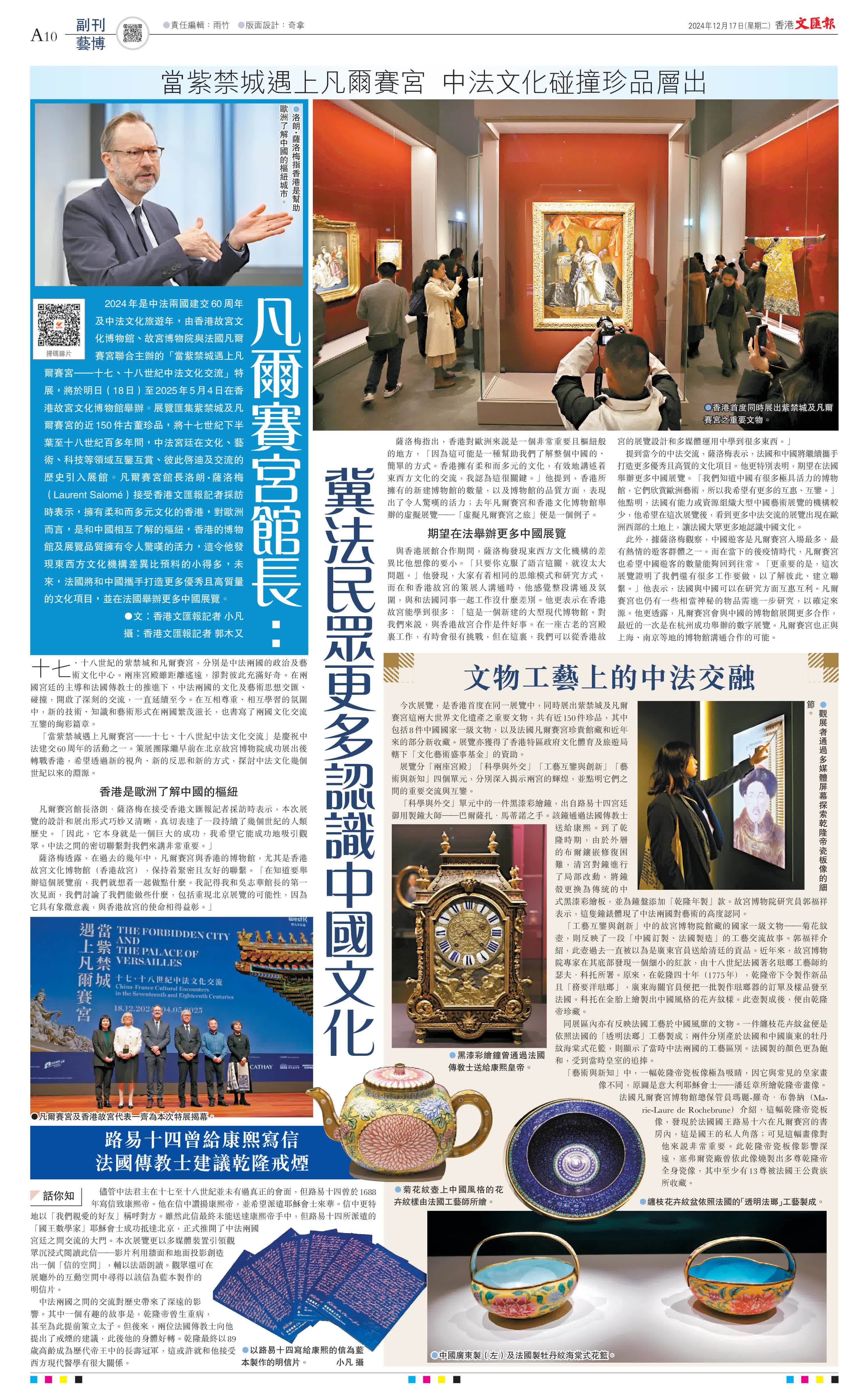 (文:香港文匯報記者 小凡 攝:香港文匯報記者 郭木又)2024年是中法兩國建交60周年及中法文化旅遊年,由香港故宮文化博物館、故宮博物院與法國凡爾賽宮聯合主辦的「當紫禁城遇上凡爾賽宮——十七、十八世紀中法文化交流」特展,將於明日(18日)至2025年5月4日在香港故宮文化博物館舉辦。展覽匯集紫禁城及凡爾賽宮的近150件古董珍品,將十七世紀下半葉至十八世紀百多年間,中法宮廷在文化、藝術、科技等領域互鑒互賞、彼此啟迪及交流的歷史引入展館。凡爾賽宮館長洛朗·薩洛梅(Laurent Salomé)接受香港文匯報記者採訪時表示,擁有柔和而多元文化的香港,對歐洲而言,是和中國相互了解的樞紐,香港的博物館及展覽品質擁有令人驚嘆的活力,這令他發現東西方文化機構差異比預料的小得多,未來,法國將和中國攜手打造更多優秀且高質量的文化項目,並在法國舉辦更多中國展覽。