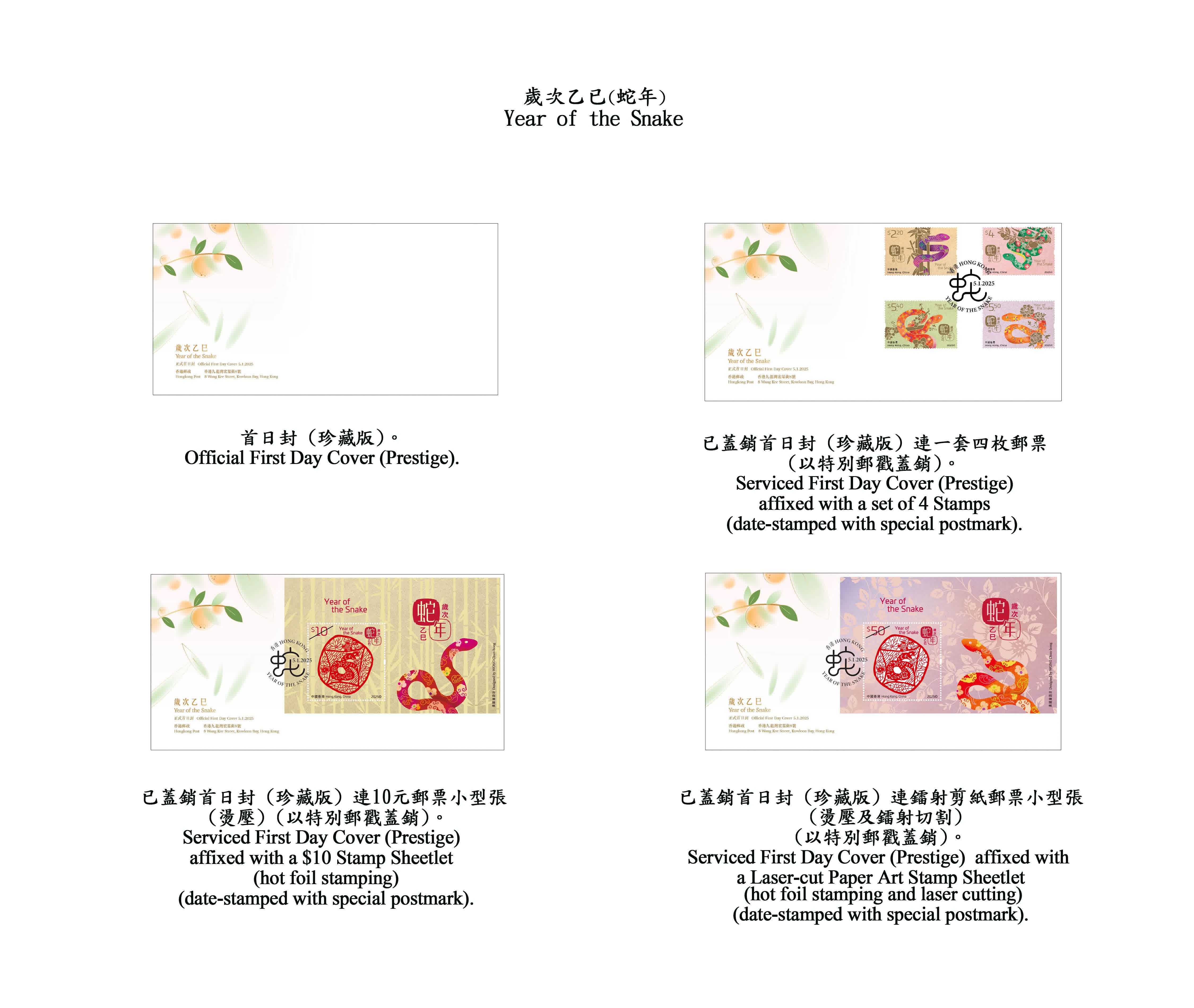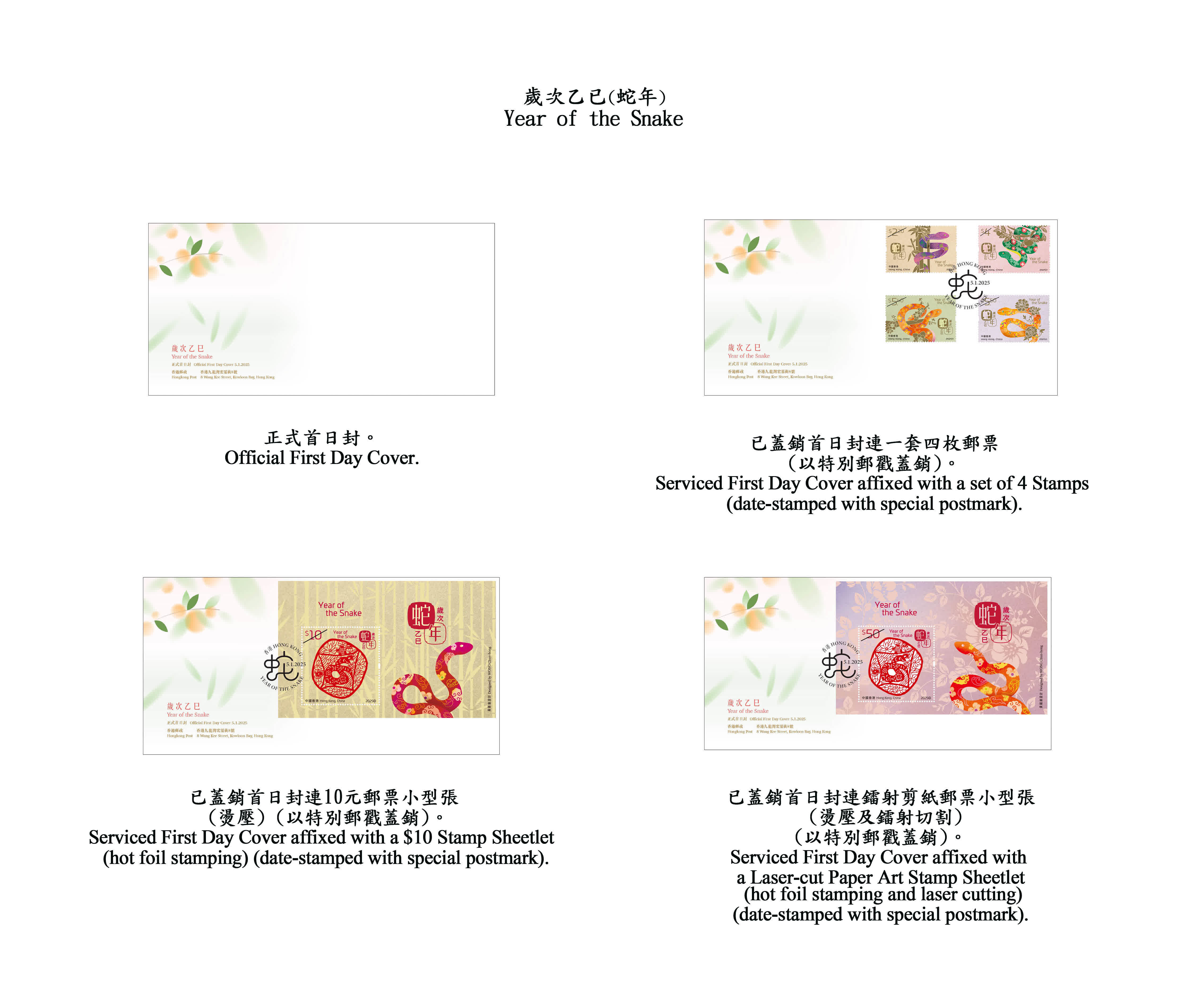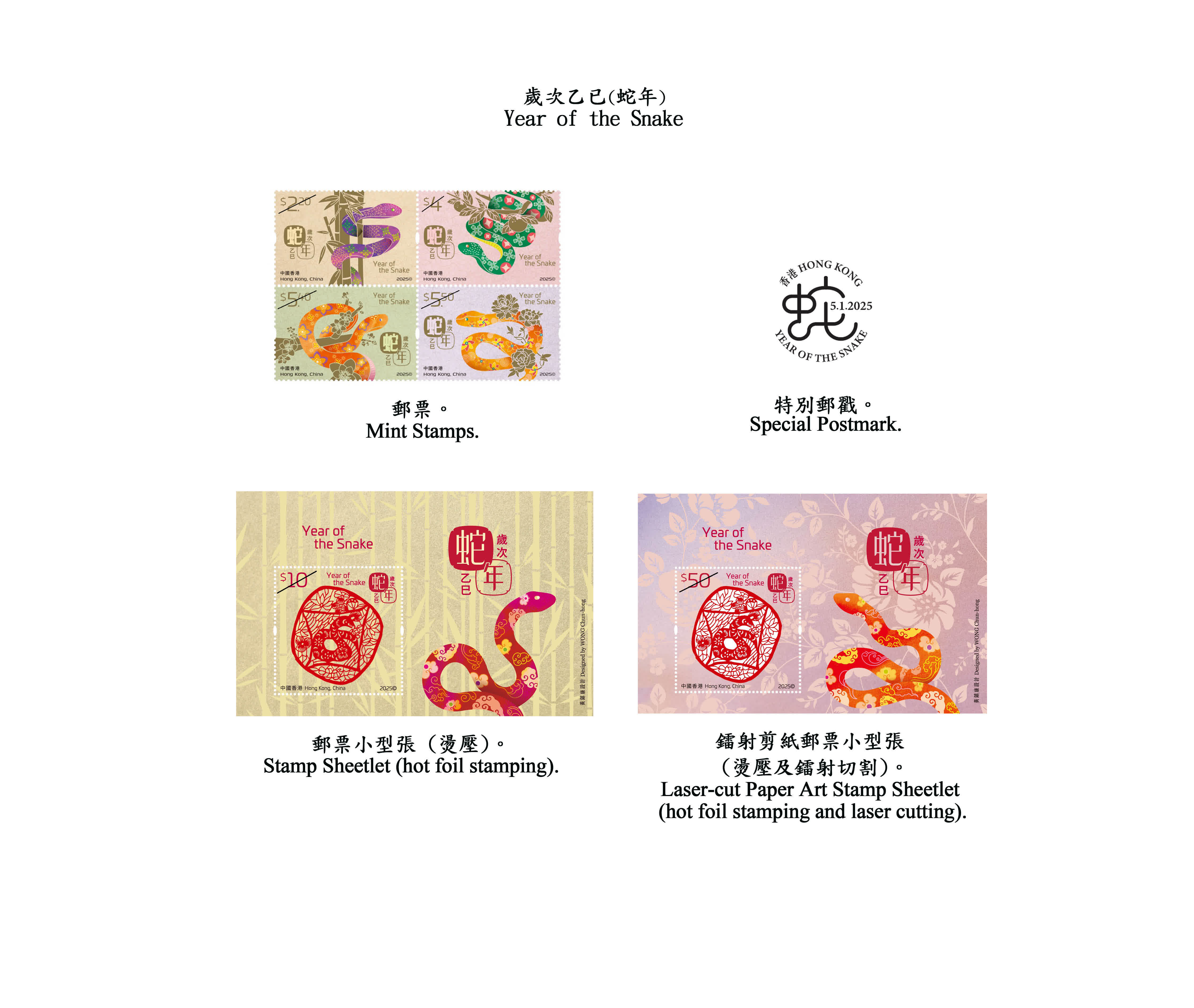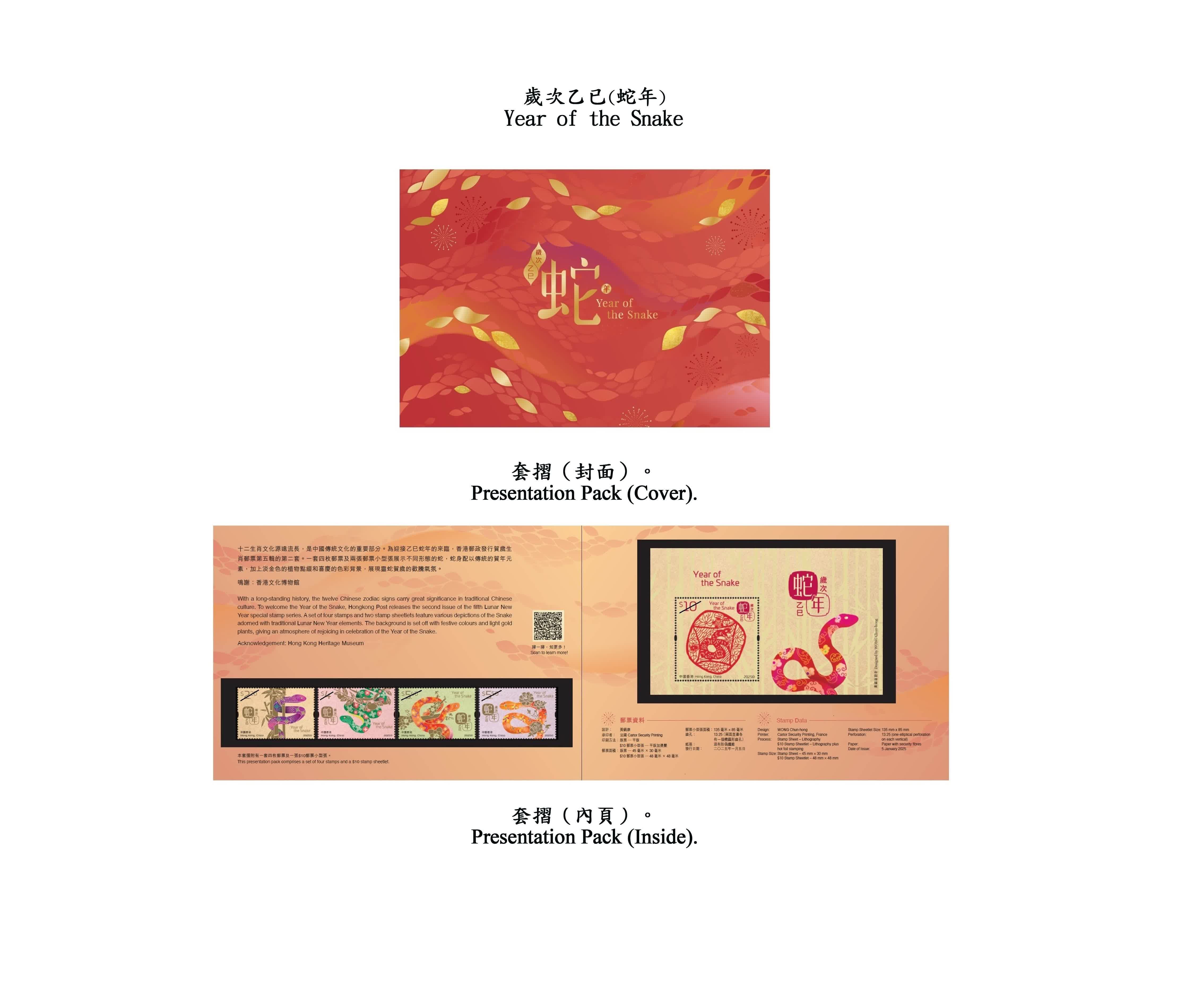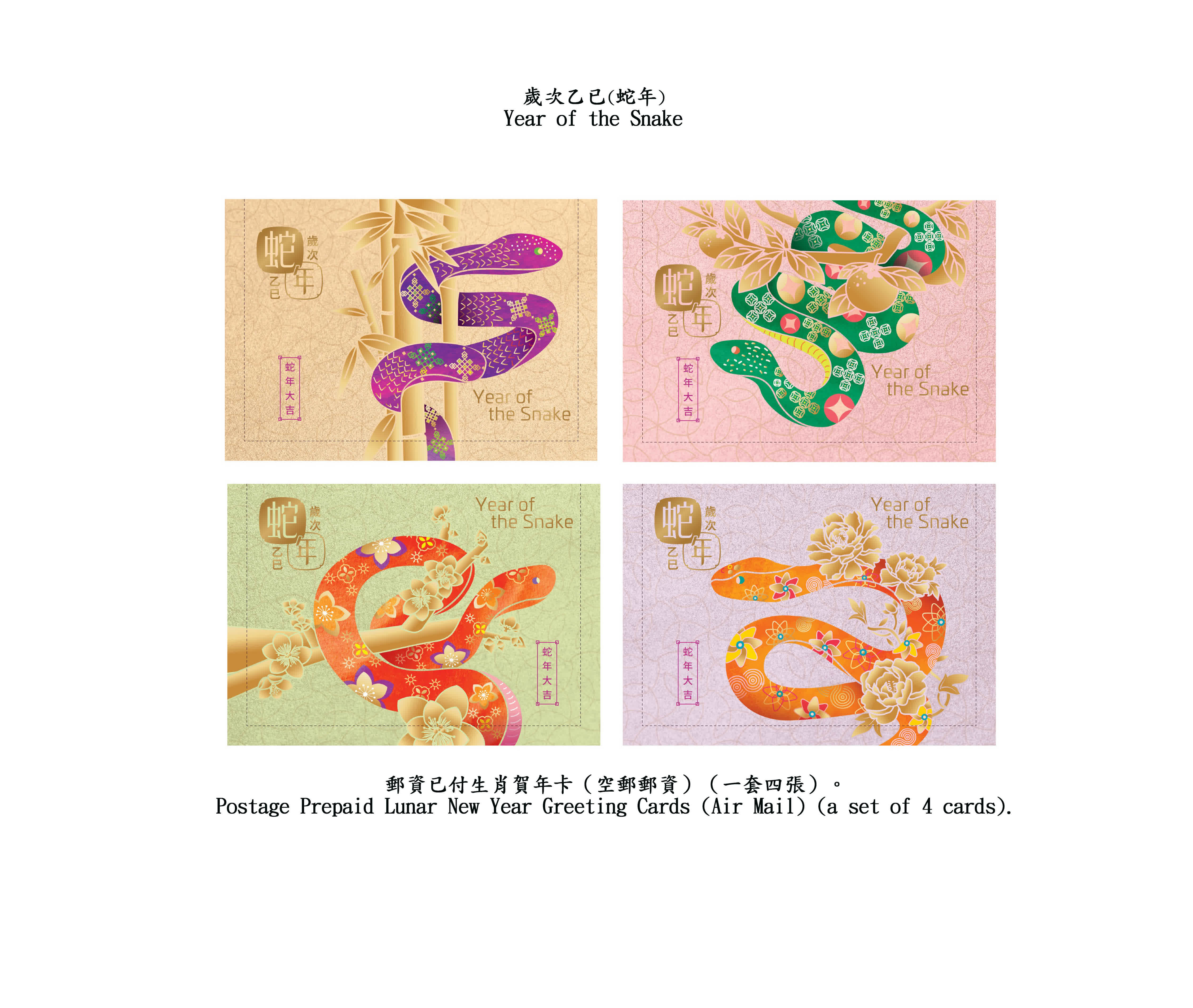 為迎接乙巳蛇年的來臨,香港郵政將發行賀歲生肖郵票第五輯的第二套。一套4枚郵票、兩張郵票小型張及相關集郵品均展示不同形態的蛇,蛇身配以傳統的賀年元素,加上淡金色的植物點綴和喜慶的色彩背景,展現靈蛇賀歲的歡騰氣氛。10元郵票小型張和50元鐳射剪紙郵票小型張分別以竹和牡丹作為背景,並以祥雲和如意鎖圖案作為蛇身的裝飾,寓意吉祥如意,歲歲平安。50元郵票小型張上的剪紙圖案更以精湛的鐳射技術切割,刻畫出細緻的蛇剪影,珍貴雅致。