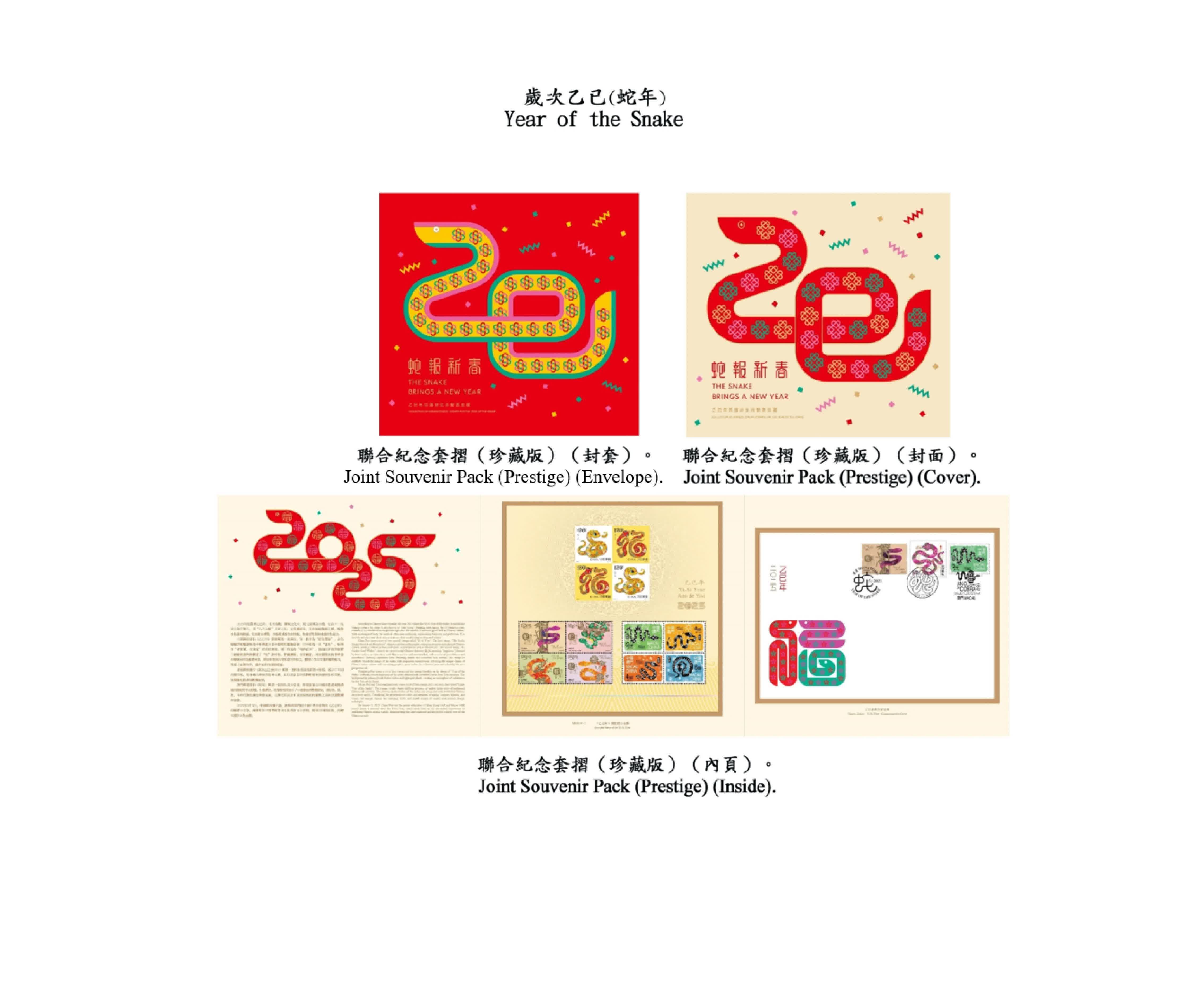 此外,中國郵政、香港郵政和澳門郵電亦會於同日共同發行蛇年聯合紀念套摺,內附三地郵政機關共同發行的生肖郵票小全張,展現三地同根同源、共融共通的文化血脈。