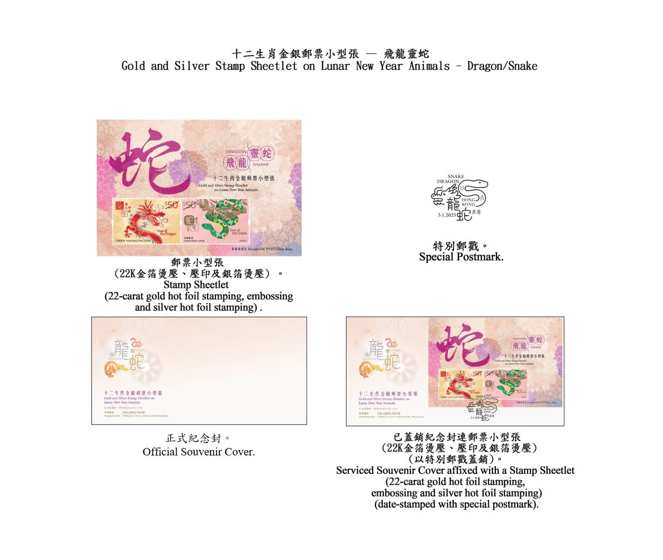 至於題為「飛龍靈蛇」的十二生肖金銀郵票小型張,是第三輯賀歲生肖金銀郵票系列的第一款,嵌有「歲次甲辰(龍年)」郵票及「歲次乙巳(蛇年)」郵票,面值各50元。郵票上的飛龍與靈蛇分別以銀箔和22K金箔燙壓而成,並附有黃金成色證明書。蛇身更以壓印技術製成,栩栩如生,動感十足。