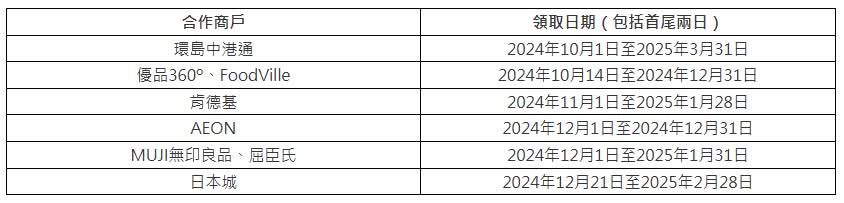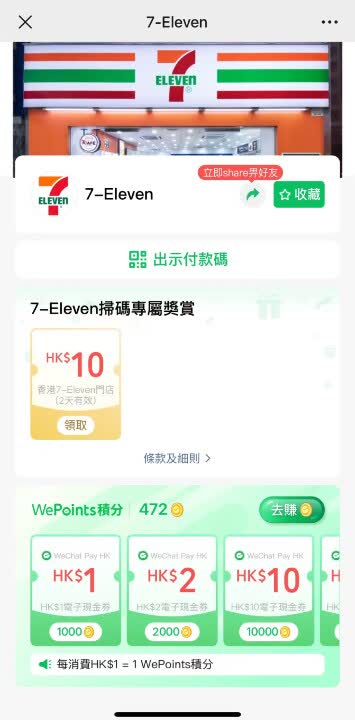 2024年12月18日至2025年1月31日期間,WeChat Pay HK用戶只需透過WeChat/微信掃描香港7-Eleven全線門市活動宣傳海報上的二維碼,進入活動頁面,可領取價值10元的7-Eleven專屬優惠券一張,於香港7-Eleven門店單筆消費滿100元可使用,推廣期內每月可領取一張。