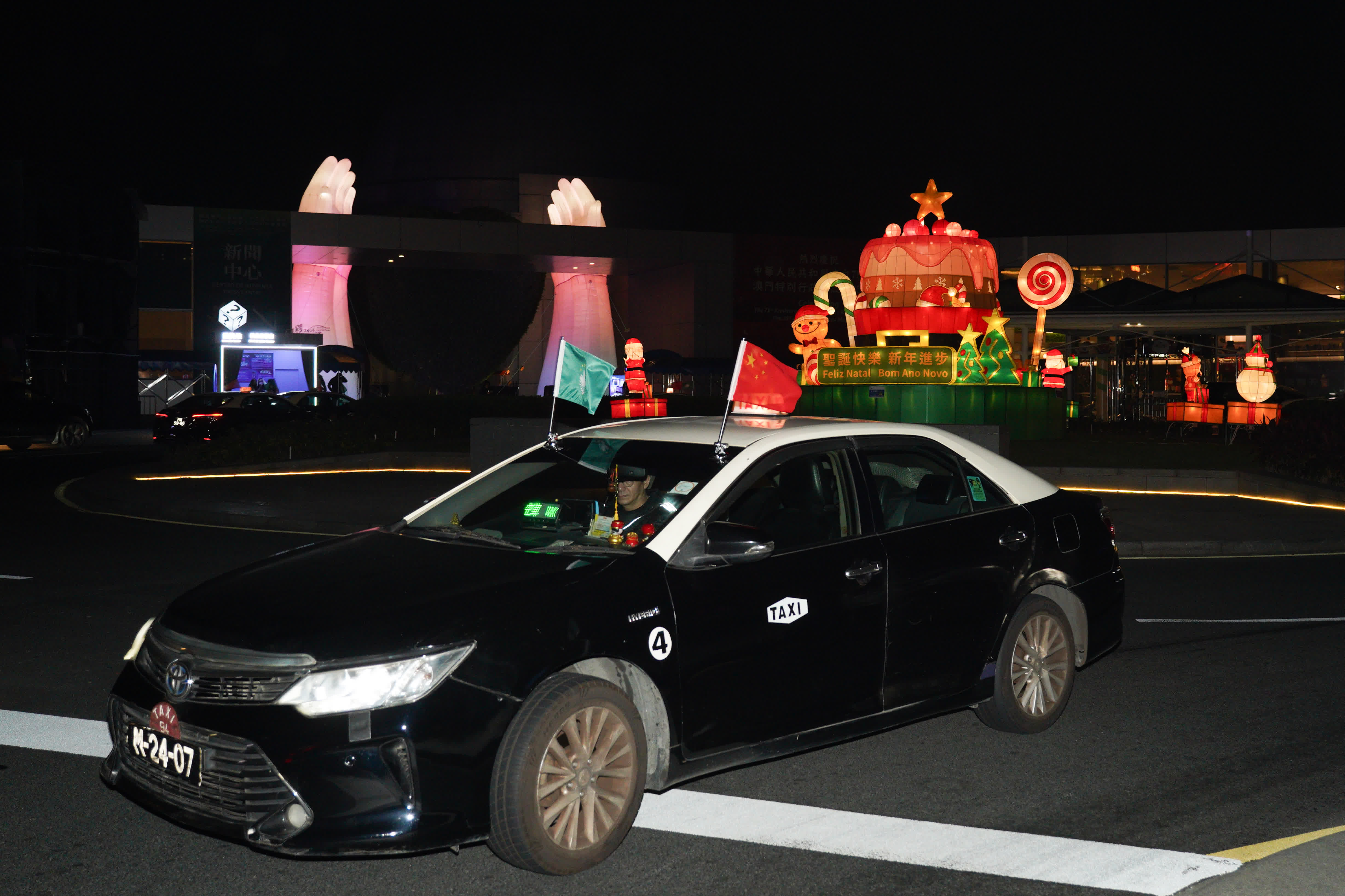 晚上8時許,30多部的士整齊地集結在澳門科學館,有序排隊等候。專業的士司機聯合會人員幫忙在車身掛上國旗及區旗。
