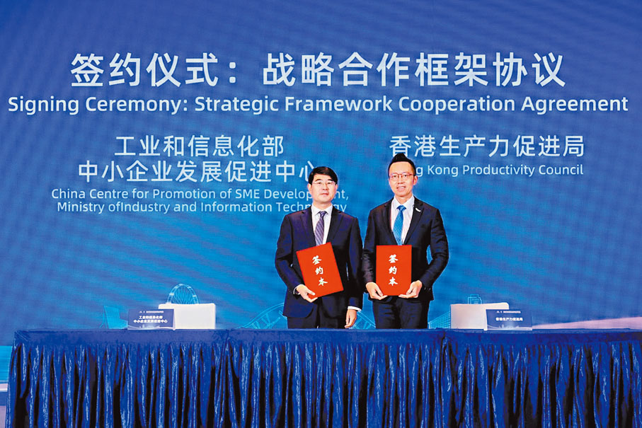 香港生產力促進局昨日與國家工業和信息化部中小企業發展促進中心(工信部中小企中心)簽署《關於促進中小企業發展戰略合作框架協議》,循支援企業出海、透過先進技術研發及成果轉化賦能企業升級轉型作為兩大重點方向,協助內地中小企用好香港「國際場景」、善用香港優勢「拼船出海」 。 ●香港文匯報記者 蔡競文