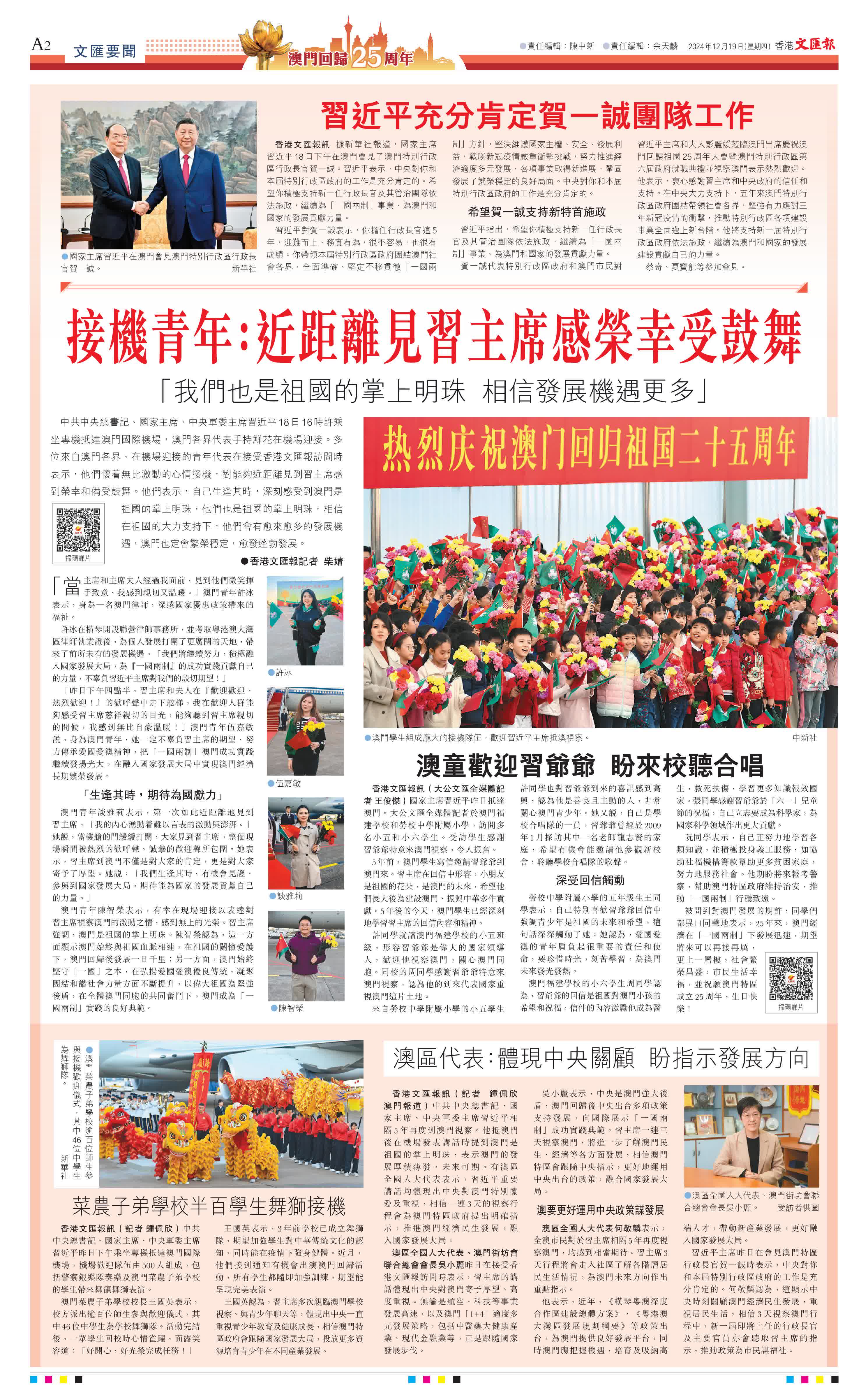 「昨日下午四點半,習主席和夫人在『歡迎歡迎、熱烈歡迎!』的歡呼聲中走下舷梯,我在歡迎人群能夠感受習主席慈祥親切的目光,能夠聽到習主席親切的問候,我感到無比自豪溫暖!」澳門青年伍嘉敏說,身為澳門青年,她一定不辜負習主席的期望,努力傳承愛國愛澳精神,把「一國兩制」澳門成功實踐繼續發揚光大,在融入國家發展大局中實現澳門經濟長期繁榮發展。