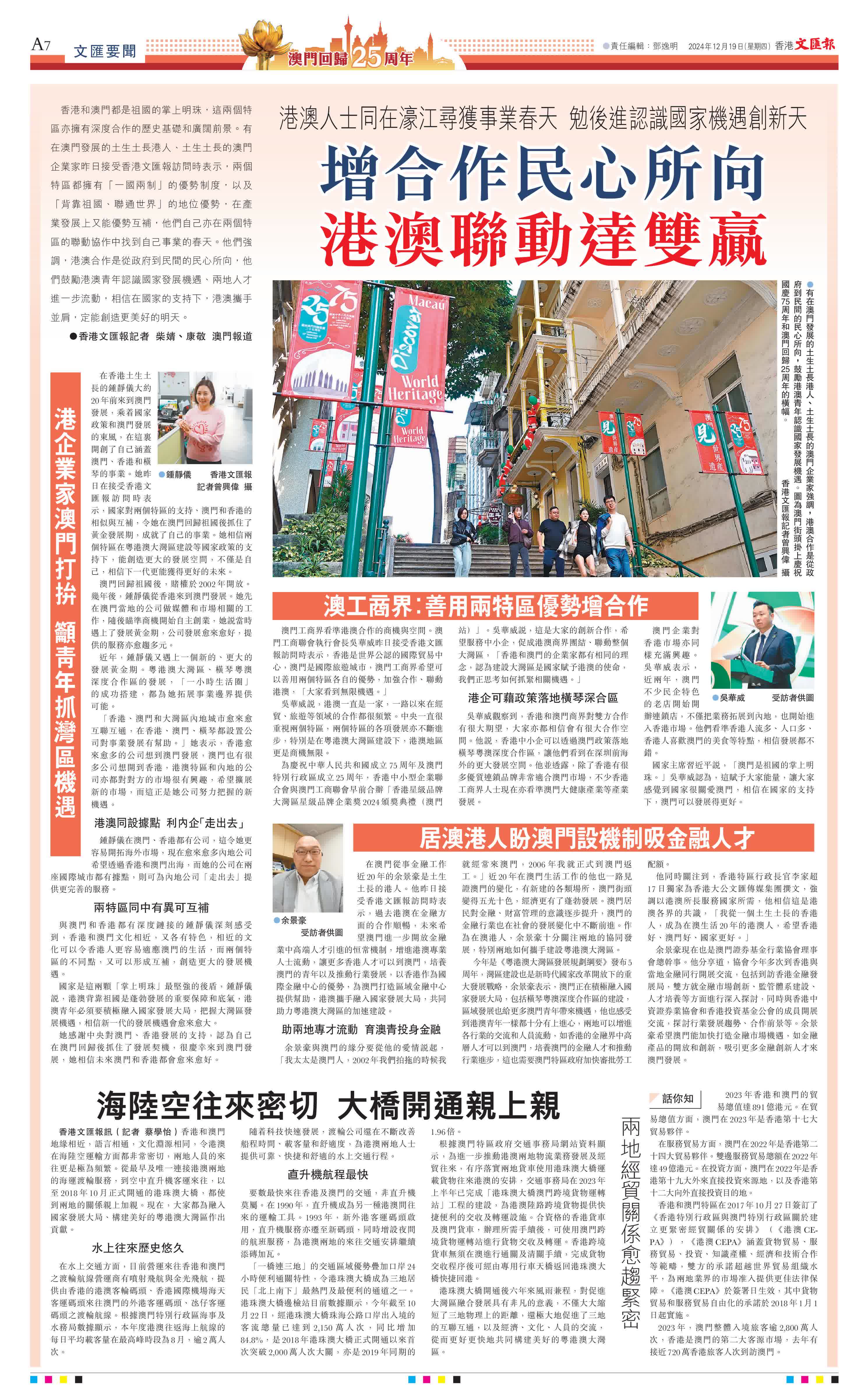 (香港文匯報記者 柴婧、康敬 澳門報道)香港和澳門都是祖國的掌上明珠,這兩個特區亦擁有深度合作的歷史基礎和廣闊前景。有在澳門發展的土生土長港人、土生土長的澳門企業家昨日接受香港文匯報訪問時表示,兩個特區都擁有「一國兩制」的優勢制度,以及「背靠祖國、聯通世界」的地位優勢,在產業發展上又能優勢互補,他們自己亦在兩個特區的聯動協作中找到自己事業的春天。他們強調,港澳合作是從政府到民間的民心所向,他們鼓勵港澳青年認識國家發展機遇、兩地人才進一步流動,相信在國家的支持下,港澳攜手並肩,定能創造更美好的明天。