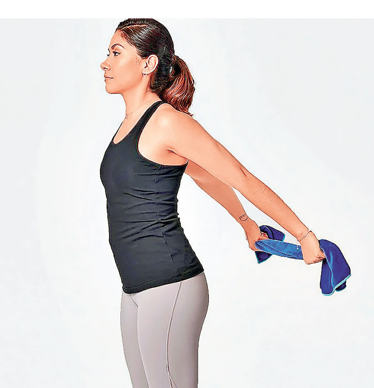 做法:將毛巾放在背後,雙手握緊上下兩端,身體挺直。