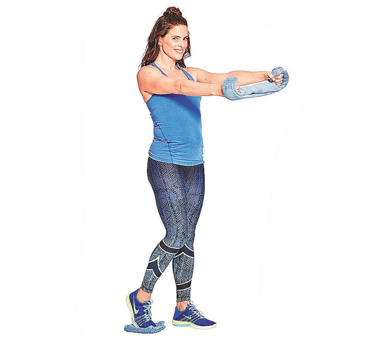 做法:雙手握住毛巾兩端,手臂伸直、平舉在胸前。
