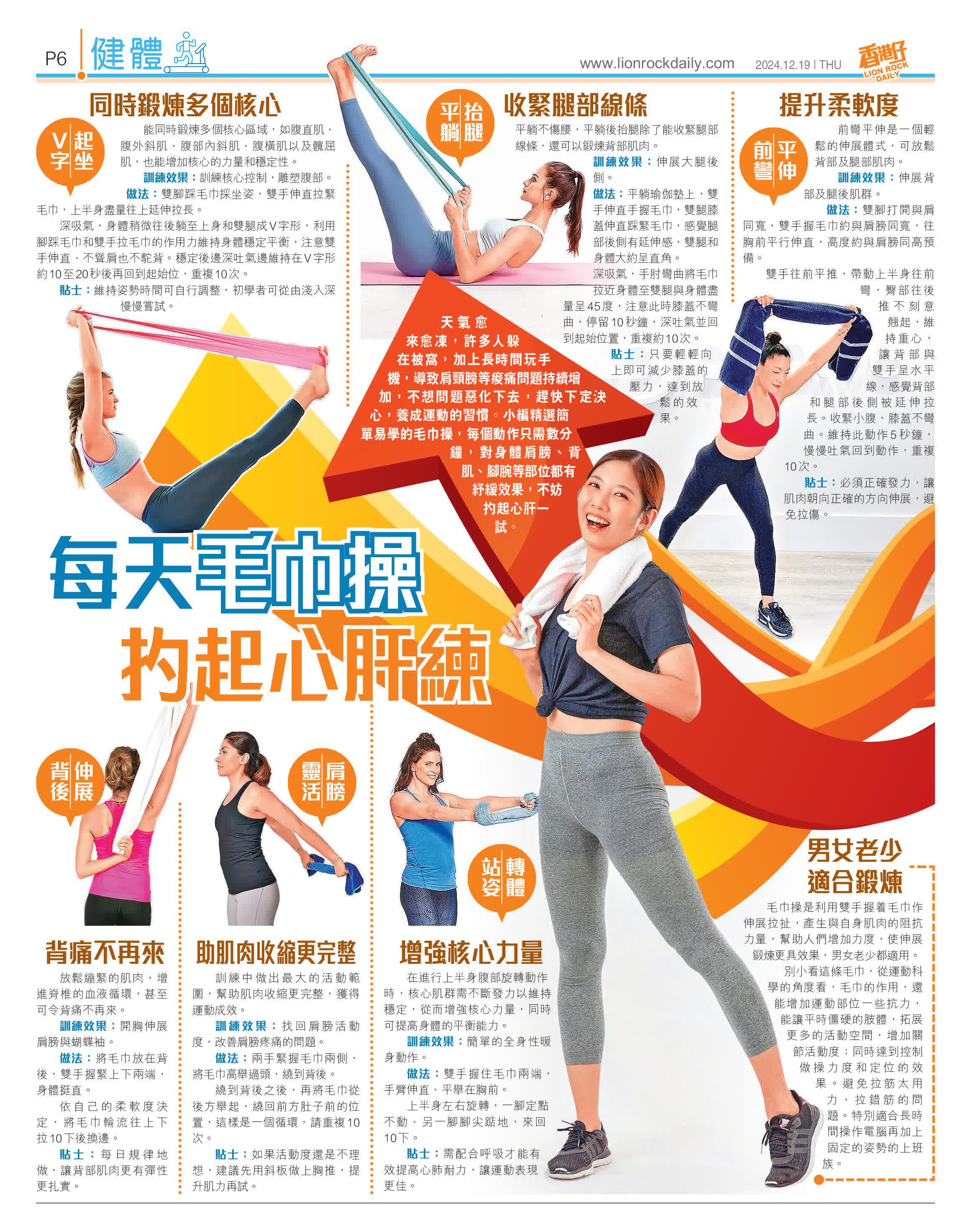 天氣愈來愈凍,許多人躲在被窩,加上長時間玩手機,導致肩頸膀等疼痛問題持續增加,不想問題惡化下去,趕快下定決心,養成運動的習慣。小編精選簡單易學的毛巾操,每個動作只需數分鐘,對身體肩膀、背肌、腳腕等部位都有紓緩效果,不妨扚起心肝一試。