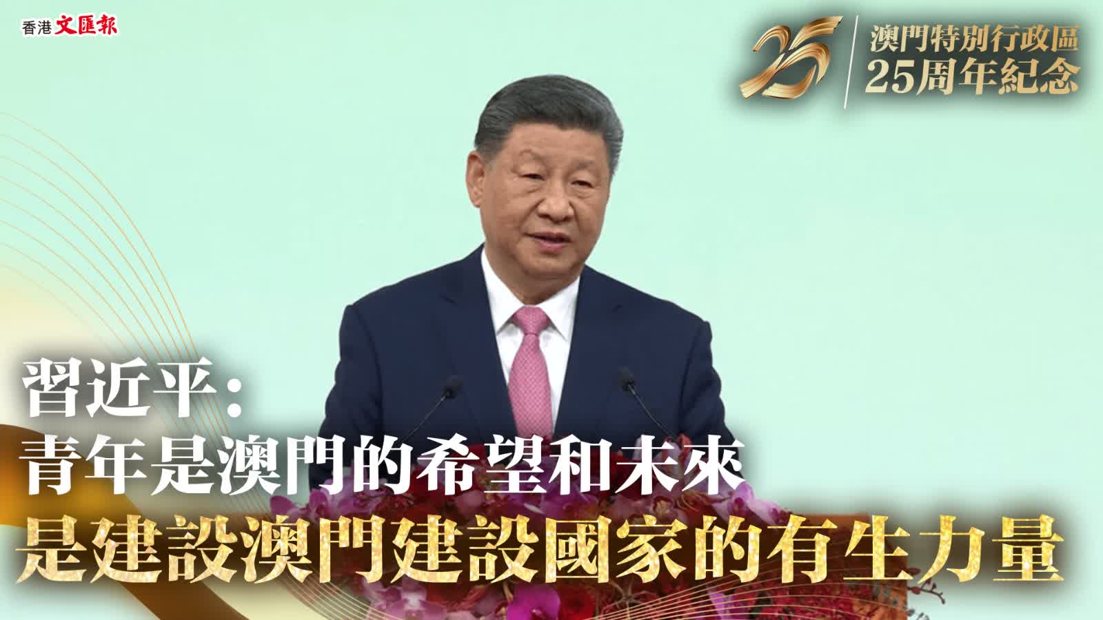 習近平:青年是澳門的希望和未來,是建設澳門、建設國家的有生力量。這兩天,我接觸了不少澳門青年朋友,他們有的成為特別行政區優秀管治人才,有的在創新創業道路上取得驕人業績,有的在教學科研崗位上一展風采,有的在國際舞台上演繹人生。特別行政區政府和社會各界要更加關愛青年,為他們成長成才、施展抱負創造更好環境和條件。希望廣大青年心繫澳門、心繫國家,志存高遠、腳踏實地,當好「一國兩制」事業的建設者和接班人,讓青春在建設強大祖國和美好澳門的廣闊天地中綻放光彩。