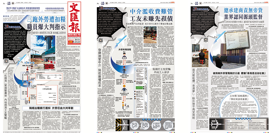 香港文匯報月前抽絲剝繭拆解三跑外勞被剝削的來龍去脈及整條產業鏈的運作和分工,同時派記者親赴內地,採訪不甘被剋扣而被分判商無理開除遣返的外勞,以及跟進報道外勞獲特區政府執法部門召回香港錄取口供。