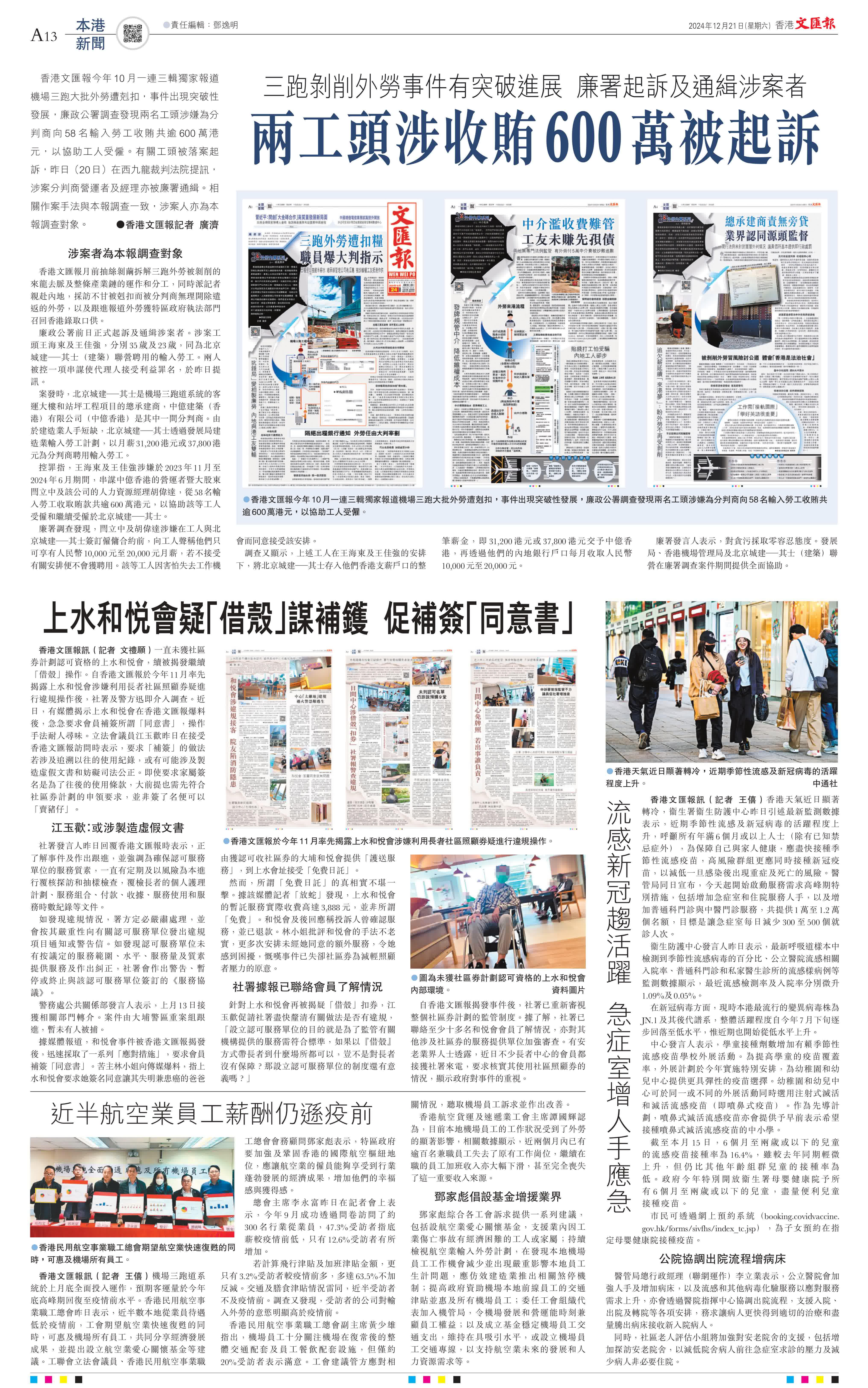 (香港文匯報記者 廣濟)香港文匯報今年10月一連三輯獨家報道機場三跑大批外勞遭剋扣,事件出現突破性發展,廉政公署調查發現兩名工頭涉嫌為分判商向58名輸入勞工收賄共逾600萬港元,以協助工人受僱。有關工頭被落案起訴,昨日(20日)在西九龍裁判法院提訊,涉案分判商營運者及經理亦被廉署通緝。相關作案手法與本報調查一致,涉案人亦為本報調查對象。