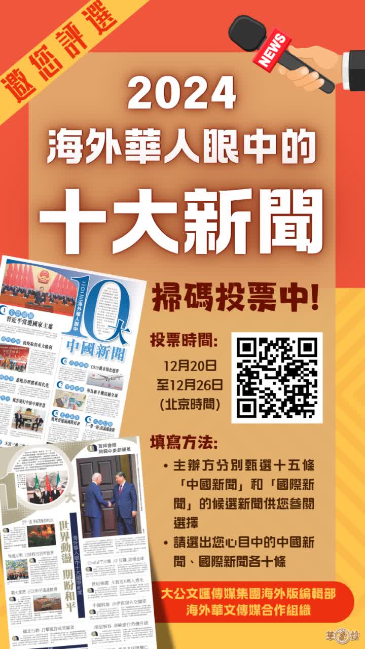 2024年極不平凡,歲末回望,大事連連。由香港大公文匯傳媒集團海外版編輯部、海外華文傳媒合作組織共同舉辦的「2024海外華人眼中十大新聞評選」活動正在進行,歡迎大家票選自己心目中的年度十大中國新聞和十大國際新聞。