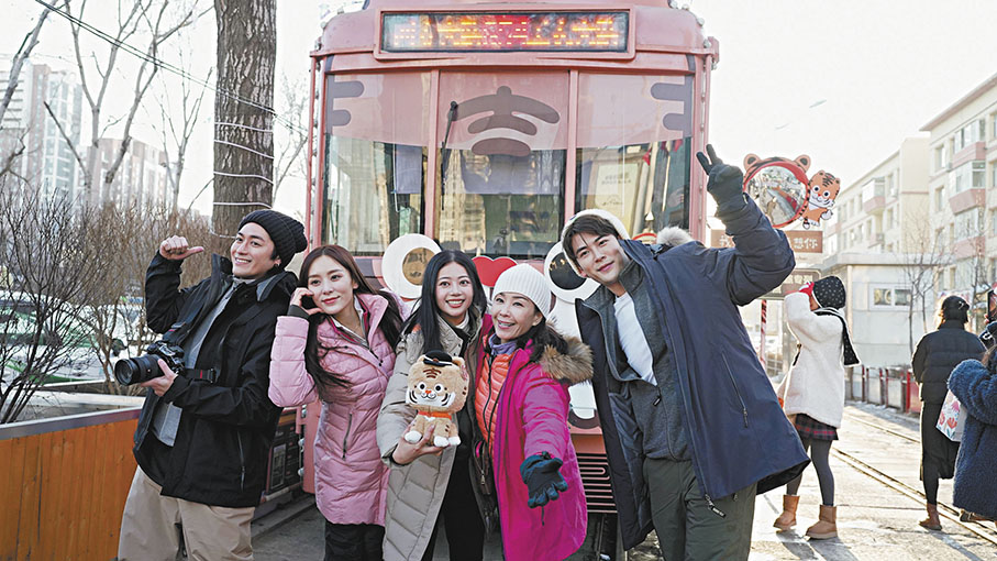 隨着電車緩緩駛入站台,一輛東北虎主題的老式有軌電車駛入站台,香港明星團踏上了這段充滿復古情懷的旅程。在短促的笛聲中,電車出發,一段最能感受長春味道的旅程即刻開啟。電車行駛在銀裝素裹的街道上,兩旁的老式建築在冬日的陽光下顯得格外莊重而寧靜。藝人們坐在復古暖色的車廂內,透過被雪花點綴的車窗,欣賞着這座城市冬日裏的獨特景致。