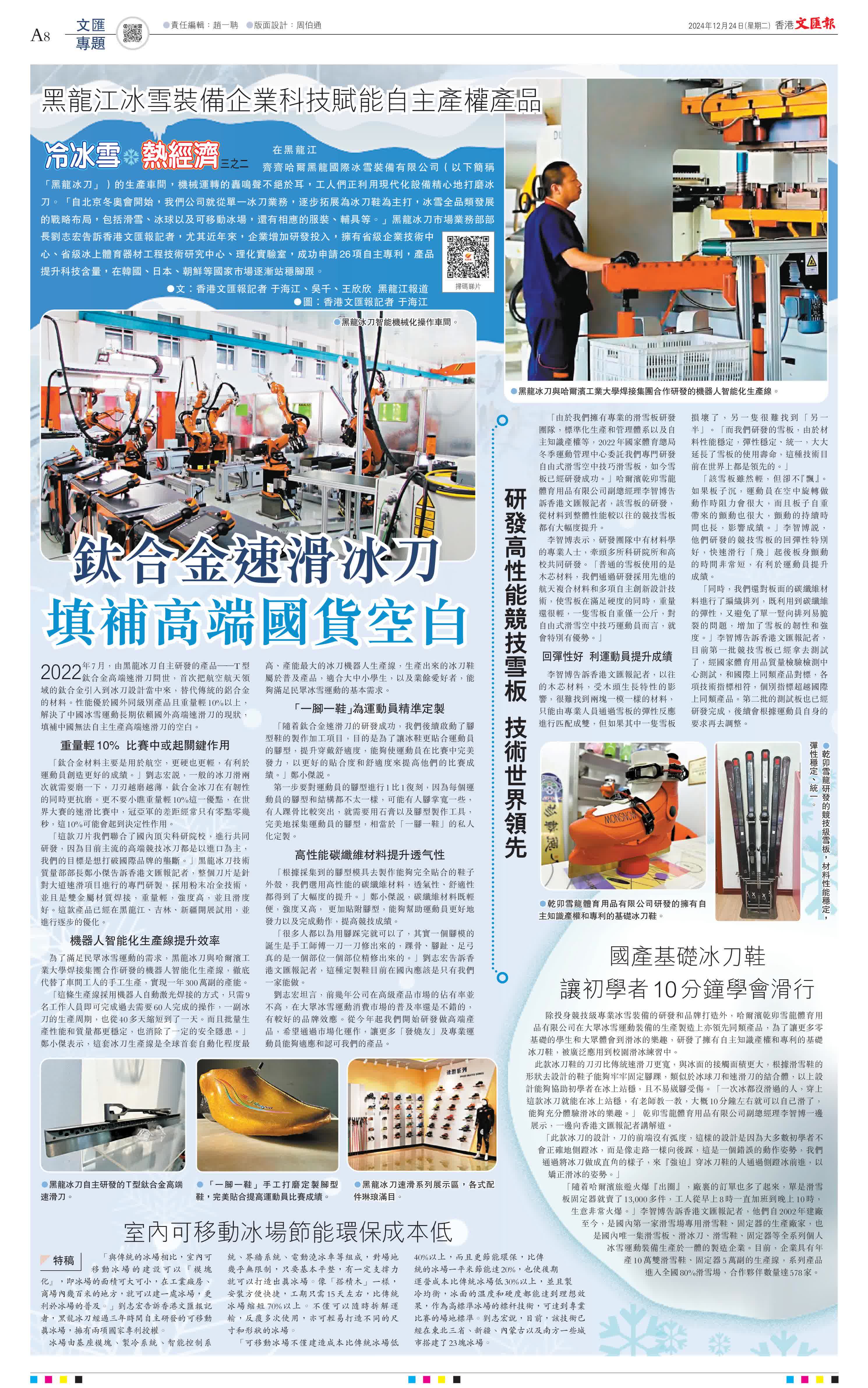 (香港文匯報記者 于海江、吳千、王欣欣 黑龍江報道)在黑龍江齊齊哈爾黑龍國際冰雪裝備有限公司(以下簡稱「黑龍冰刀」)的生產車間,機械運轉的轟鳴聲不絕於耳,工人們正利用現代化設備精心地打磨冰刀。「自北京冬奧會開始,我們公司就從單一冰刀業務,逐步拓展為冰刀鞋為主打,冰雪全品類發展的戰略布局,包括滑雪、冰球以及可移動冰場,還有相應的服裝、輔具等。」黑龍冰刀市場業務部部長劉志宏告訴香港文匯報記者,尤其近年來,企業增加研發投入,擁有省級企業技術中心、省級冰上體育器材工程技術研究中心、理化實驗室,成功申請26項自主專利,產品提升科技含量,在韓國、日本、朝鮮等國家市場逐漸站穩腳跟。