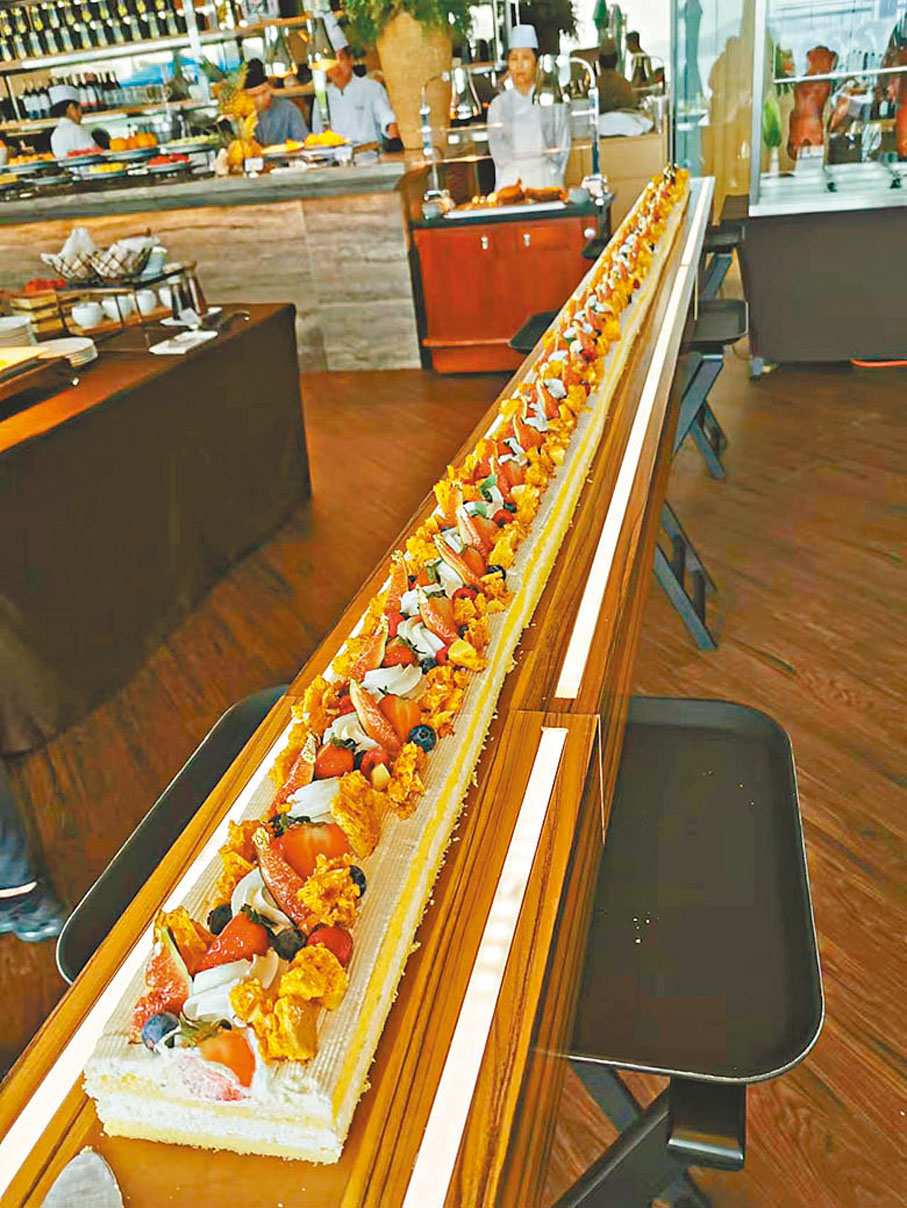 當大家吃得滿飽的時候,餐廳突然傳來敲鈴聲,長達18呎的巨型鮮果蛋糕已為大家準備好,這條超長蛋糕,場面壯觀,為食客們開心狂打卡之餘送上滿滿的驚喜,而且巨型鮮果蛋糕入口真是很美味。