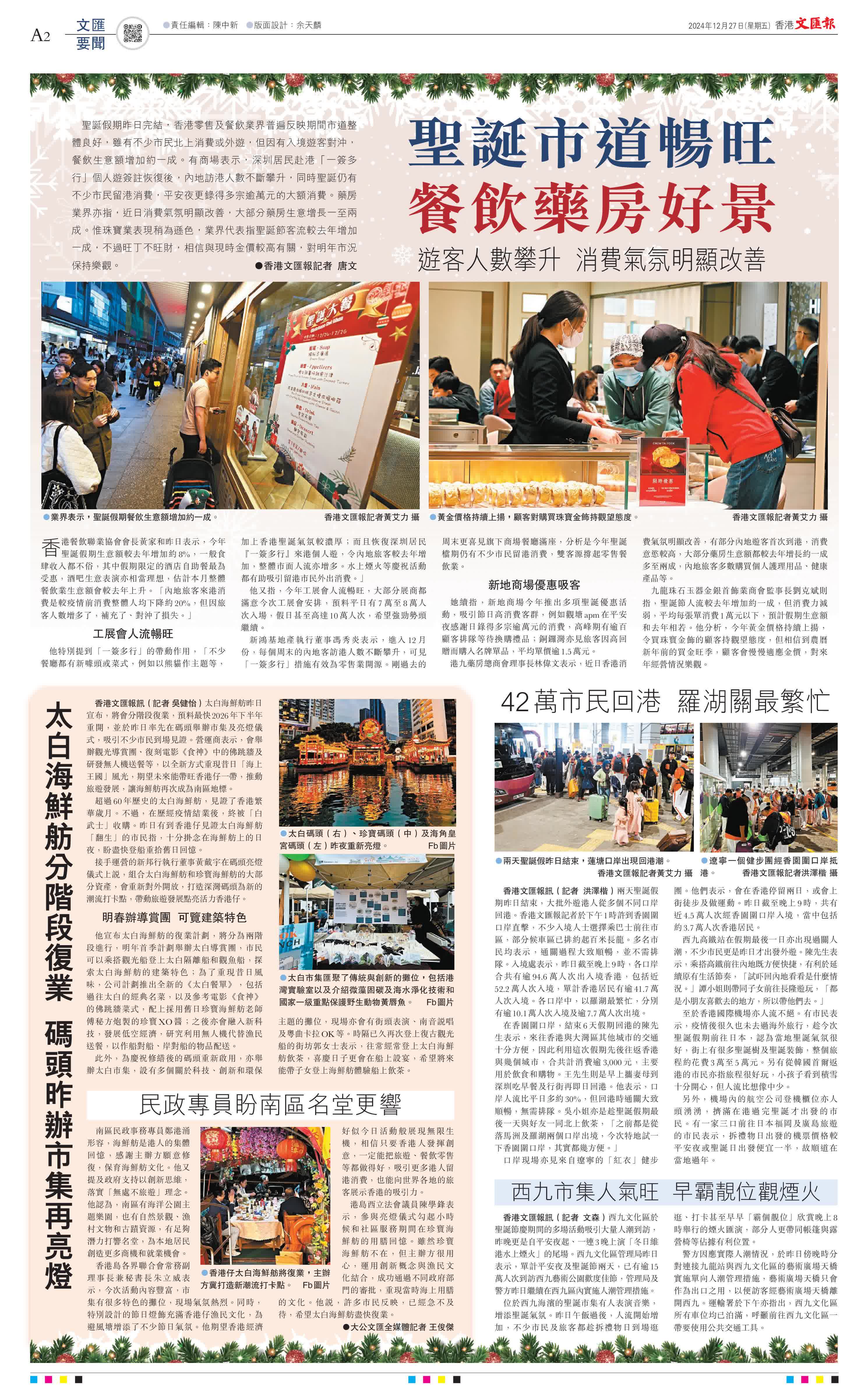 香港餐飲聯業協會會長黃家和昨日表示,今年聖誕假期生意額較去年增加約8%,一般食肆收入都不俗,其中假期限定的酒店自助餐最為受惠,酒吧生意表演亦相當理想,估計本月整體餐飲業生意額會較去年上升。「內地旅客來港消費是較疫情前消費整體人均下降約20%,但因旅客人數增多了,補充了、對沖了損失。」