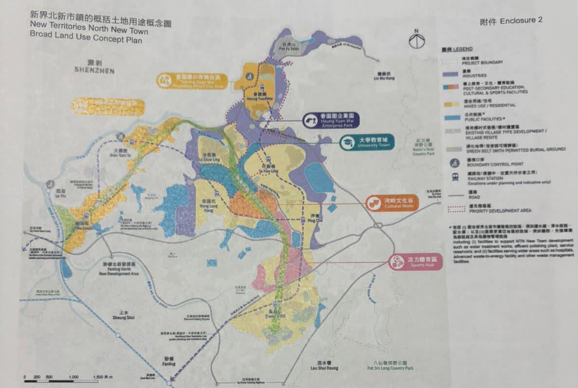 新界北新市鎮預計約20年或更長時間分階段推展,因此會首先推展206公頃的「優先發展區」,考慮到公營房屋並非新界北新市鎮的首要實施重點,當局建議先行發展香園圍地區,包括口岸商住區、企業園和大學教育城,以推動口岸經濟,發展新興產業,以及培育高端人才。