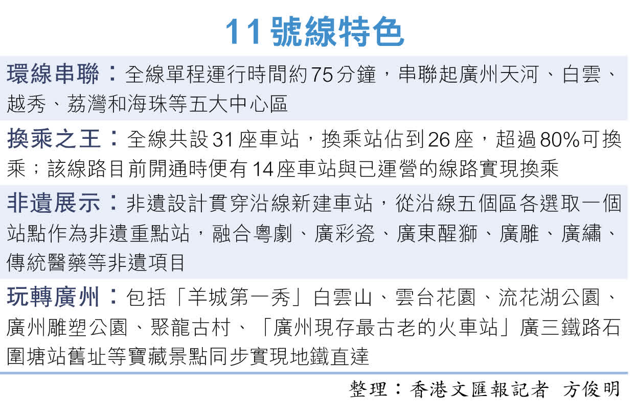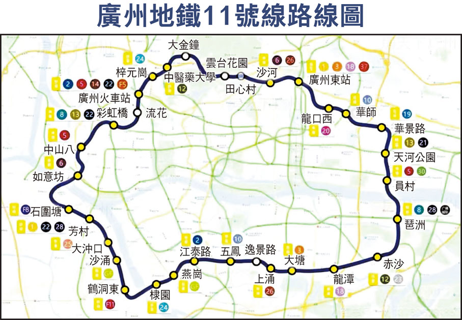 灣區首條「地鐵環線」廣州地鐵11號線全程44.2公里,線路途經天河、白雲、越秀、荔灣和海珠5個中心區,以「環」為形,勾勒出廣州的「城市圈」「交通圈」和「經濟圈」。其中,全面覆蓋珠江新城、天河北等廣州中央商務區建成區,「環圈」現時廣州經濟密度最高的區域;而且途經多個重要的交通樞紐和城市功能組團,連接廣州火車站、廣州東站兩大交通樞紐,串起琶洲、金融城、天河北、白鵝潭、中大國際創新生態谷等重點發展板塊,將為廣州地鐵線網的聯通度帶來質的飛躍。