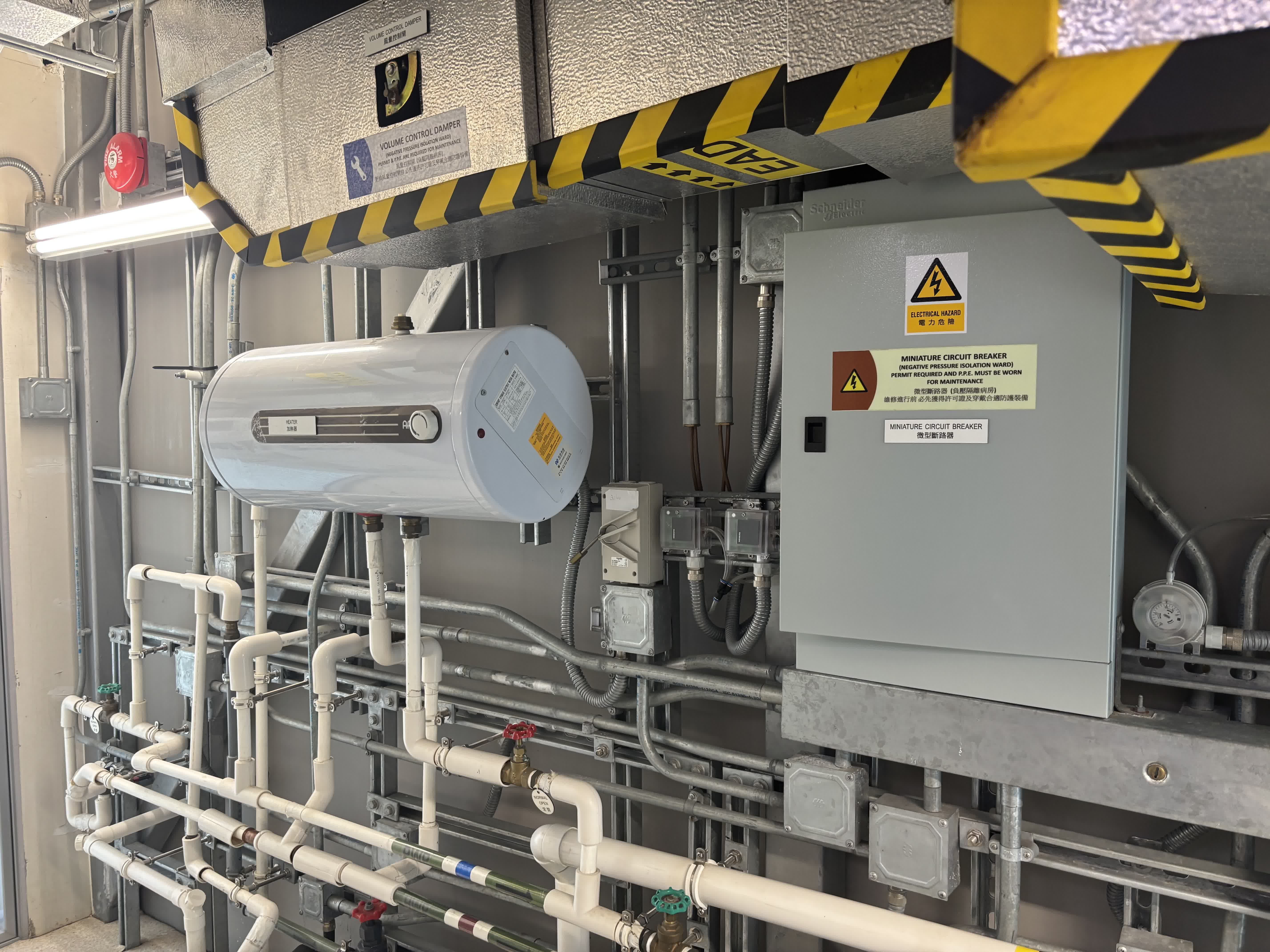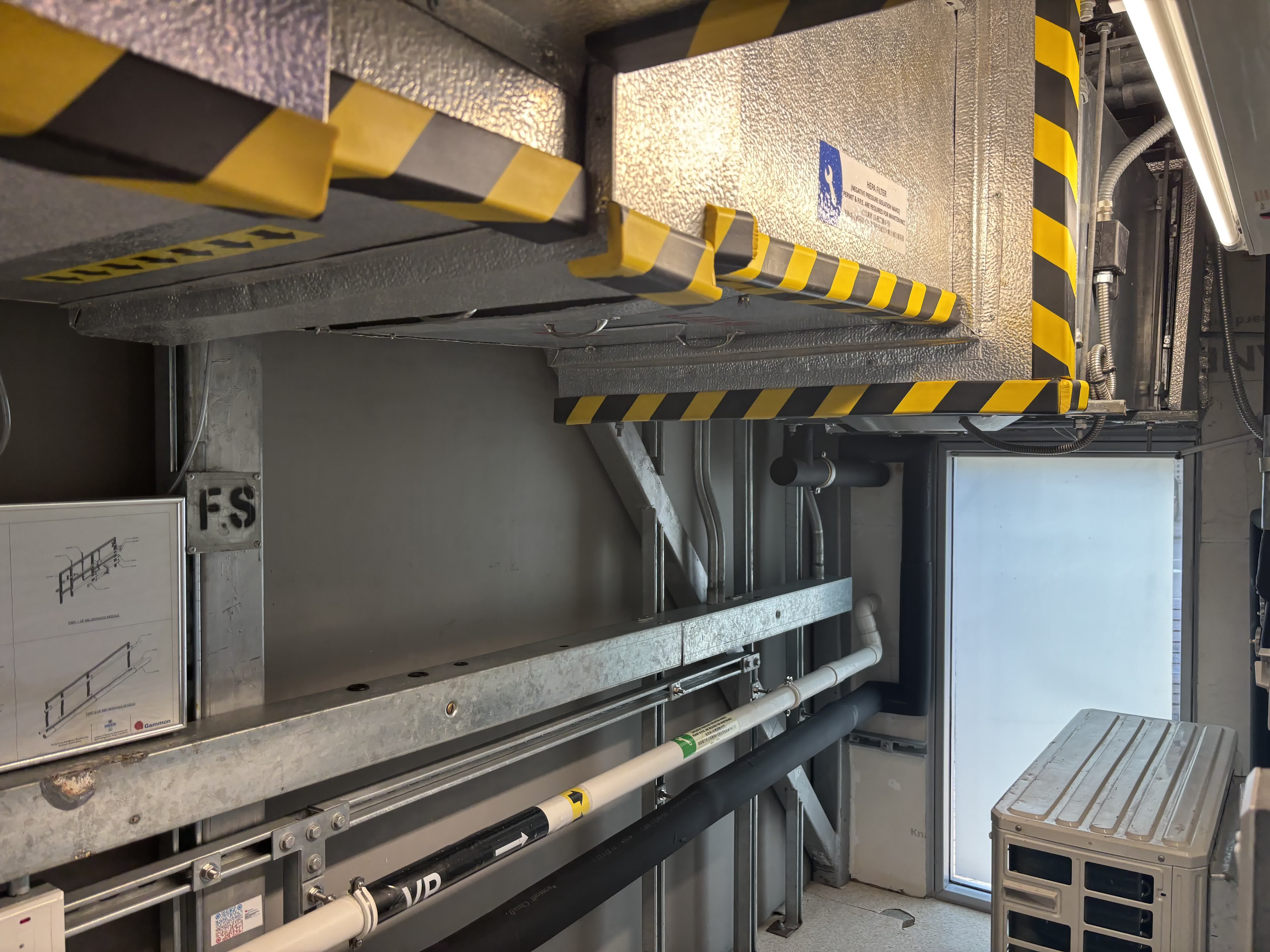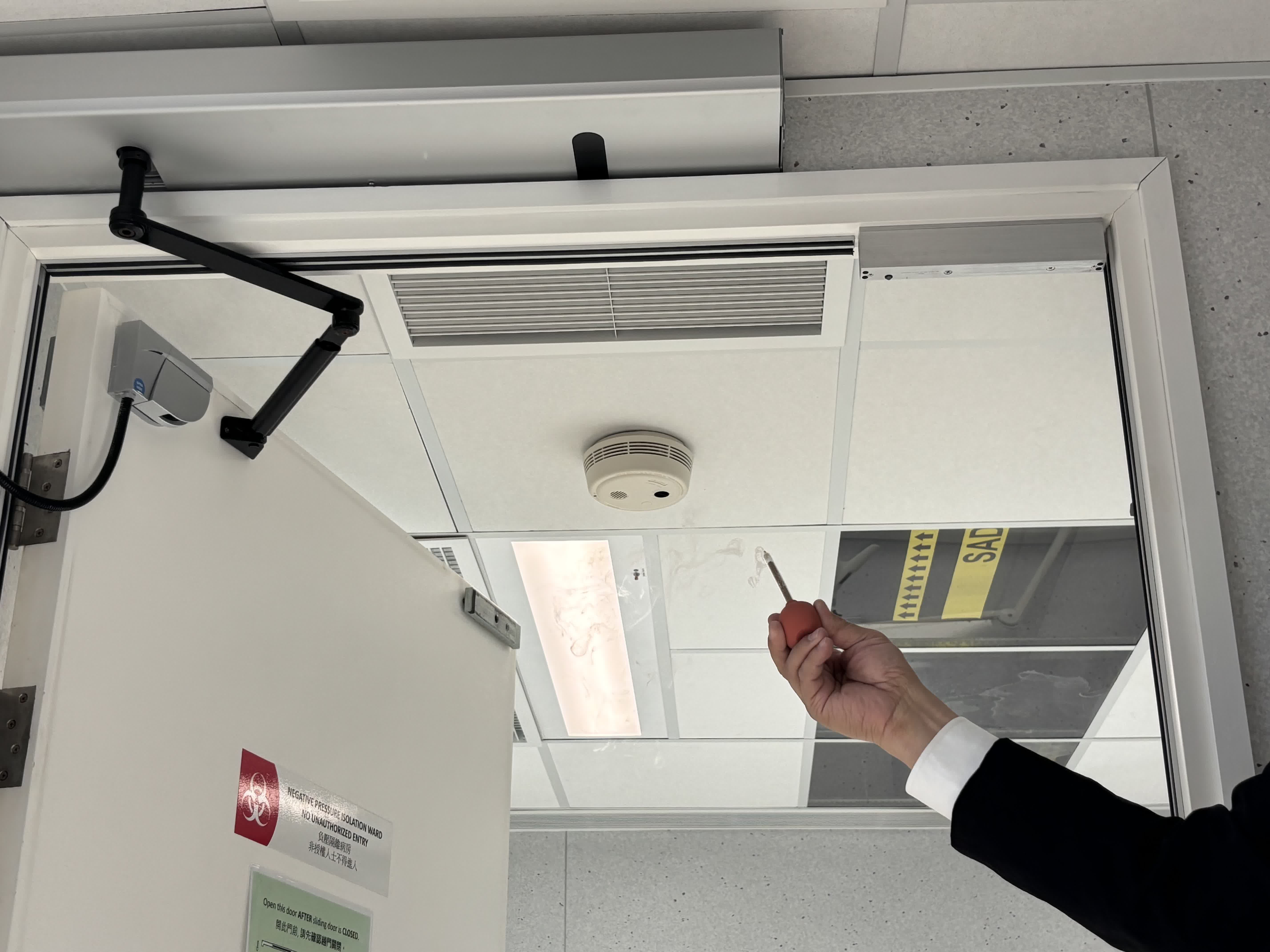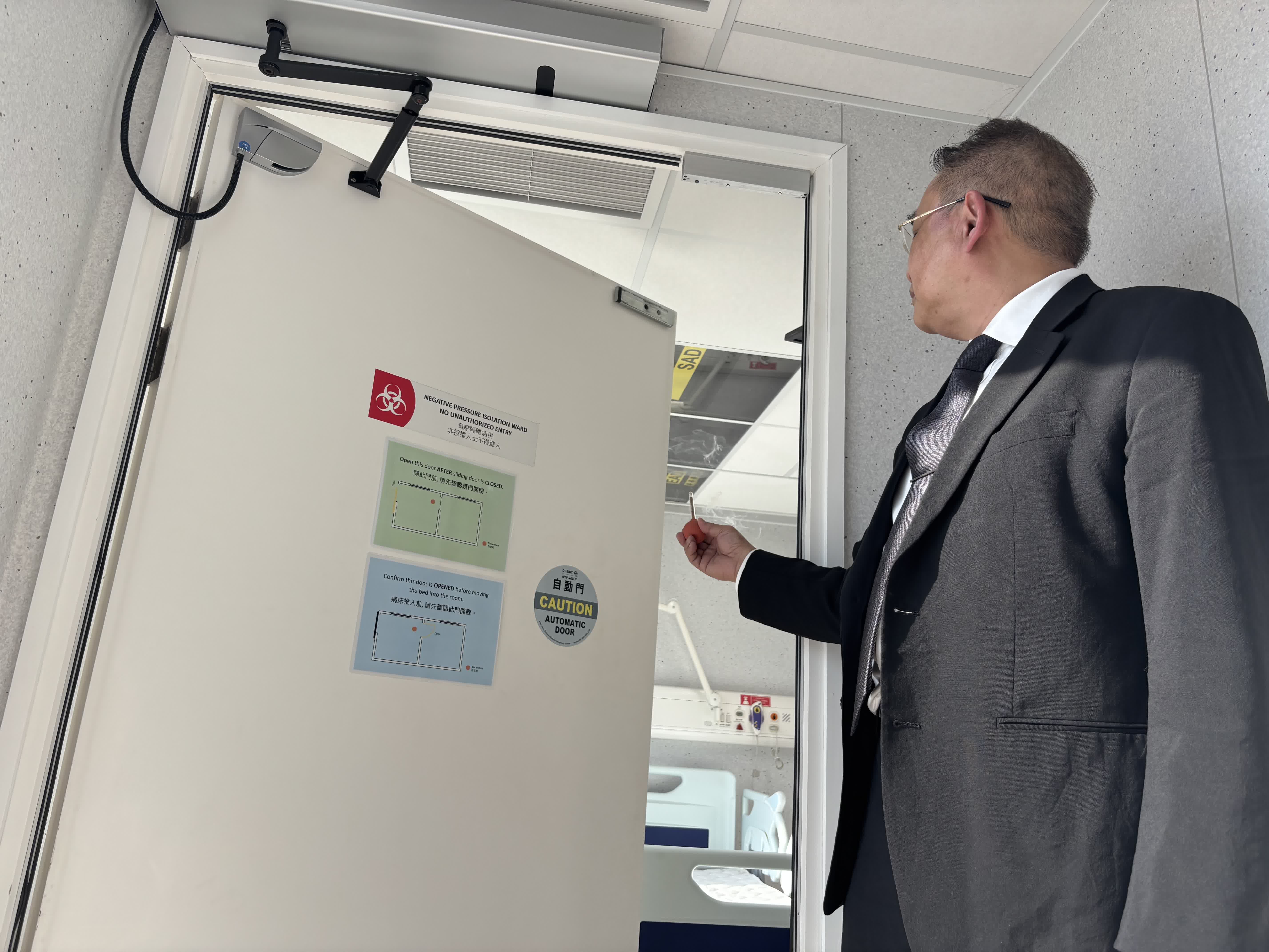源栢樑介紹,高規格負壓隔離病房並不是簡單的方艙,其有雙重門的設計,每次僅能開啟一道門,並通過工程手段,製造氣流控制,抽風量多、送風量少,製造向病房入流的方向,阻止病房內不潔的空氣流出室外,並運用送進來的風稀釋病房內空氣。他形容這個病房為「麻雀雖小,五臟俱全」。