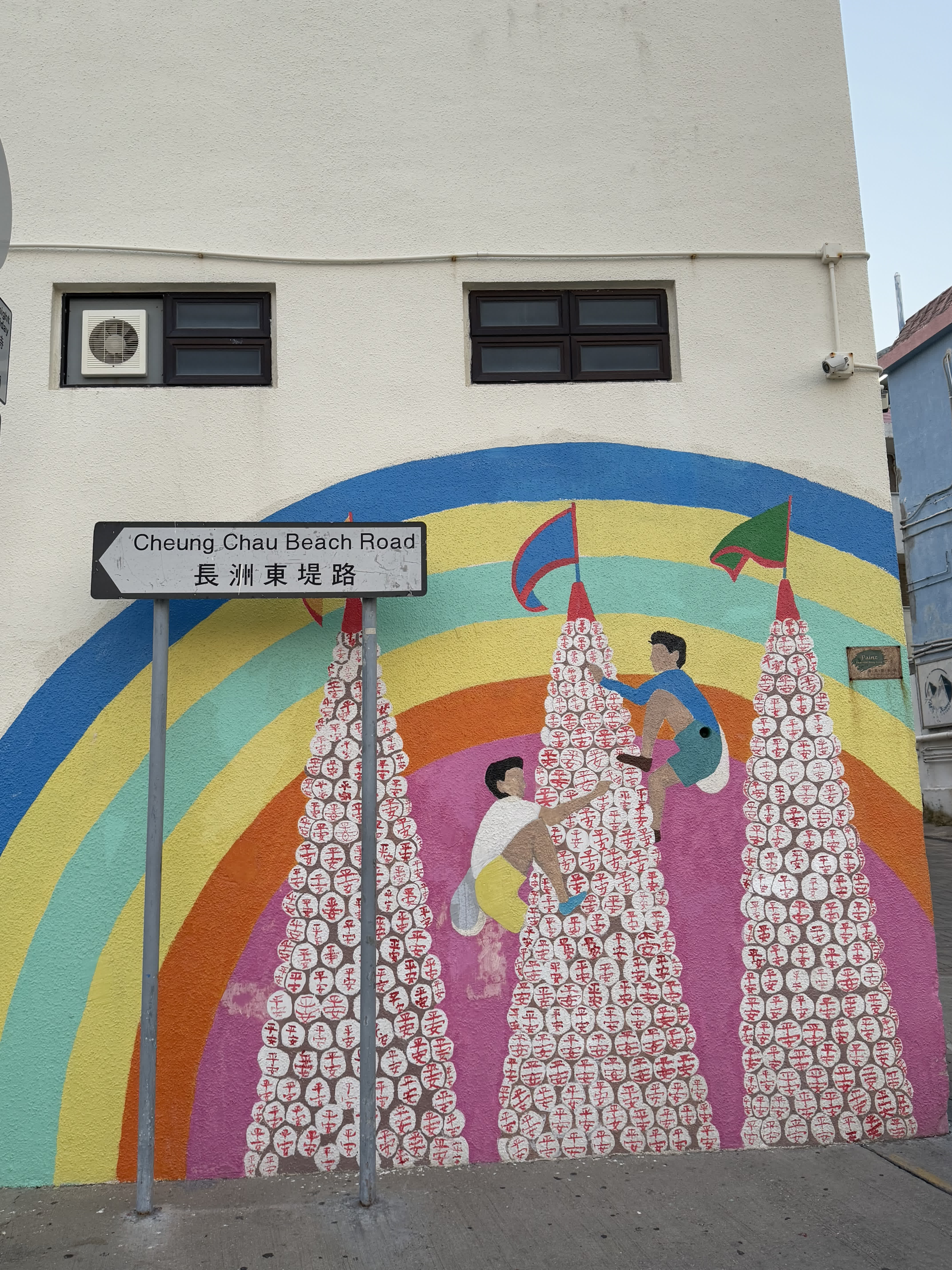 社交媒體上有許多遊客鍾愛打卡一面「搶包山」的壁畫,位於長洲東堤路,沿着東灣泳灘北行就能找到。色彩鮮明的畫作將長洲最具代表性的民俗節慶—太平清醮—生動呈現於眼前。壁畫描繪了搶包山比賽的場面,選手正奮力攀爬高聳的包山,瞬間將欣賞壁畫的遊客帶入到節日的歡樂氛圍。