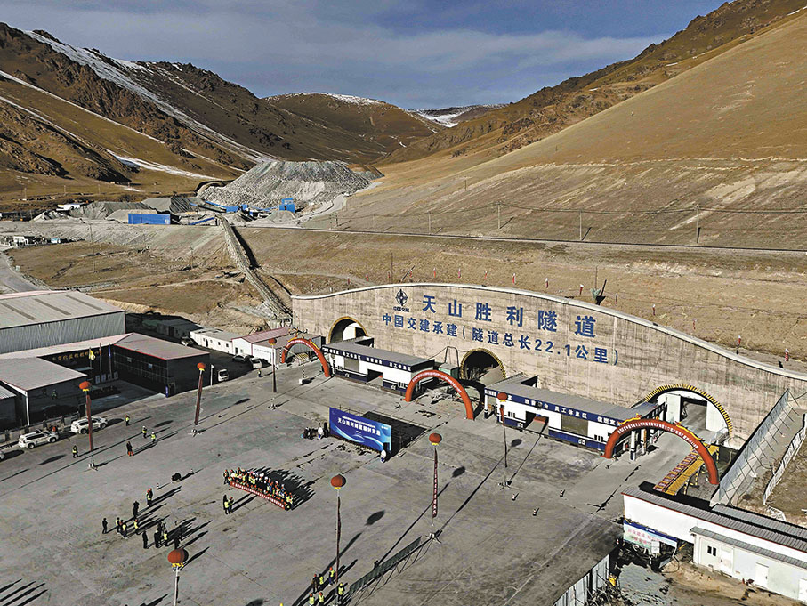 天山勝利隧道是國內在建高速公路中典型的特長、高寒、高海拔公路隧道,所處地域地質條件極其複雜。建設者們首次使用了中國自主研發、專門為天山勝利隧道量身定做的2台硬岩掘進機(TBM),並創新使用全球首創的新型壓注式工法及配套TBM裝備施工,打破了國外同領域技術和設備壟斷。同時,左、中、右三個洞口同時掘進,左右兩個為直徑達14米的雙車道主隧道,中間的中導洞(服務隧道)直徑8.4米,採用TBM領先掘進施工,為左右雙主洞開闢輔助工作面,將整條隧道「切割」,實現「長隧超短打」。工期由常規「兩端掘進」施工的10年縮短至4年多,填補了國內隧道施工技術的空白。