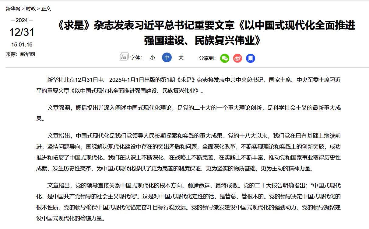2025年1月1日出版的第1期《求是》雜誌將發表中共中央總書記、國家主席、中央軍委主席習近平的重要文章《以中國式現代化全面推進強國建設、民族復興偉業》。