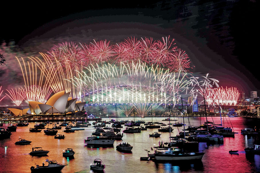 悉尼的經典跨年煙花表演今次增添新亮點,首次在地標建築海港大橋東西兩側,同時設置煙花燃放點。當地於2024年12月31日晚上9時率先舉行「家庭煙花騷」,海港多個煙花燃放點都燃放大量煙花,配合燈光交織成為繽紛景象。到跨年一刻,12分鐘的「跨年煙火騷」如約而至,煙花從悉尼海港大橋和歌劇院等多個景點同步燃放,場面盛大。連同另外200多個陸上及水上發射煙花的平台,合共發放逾5.3萬枚、多達9,000公斤煙花。